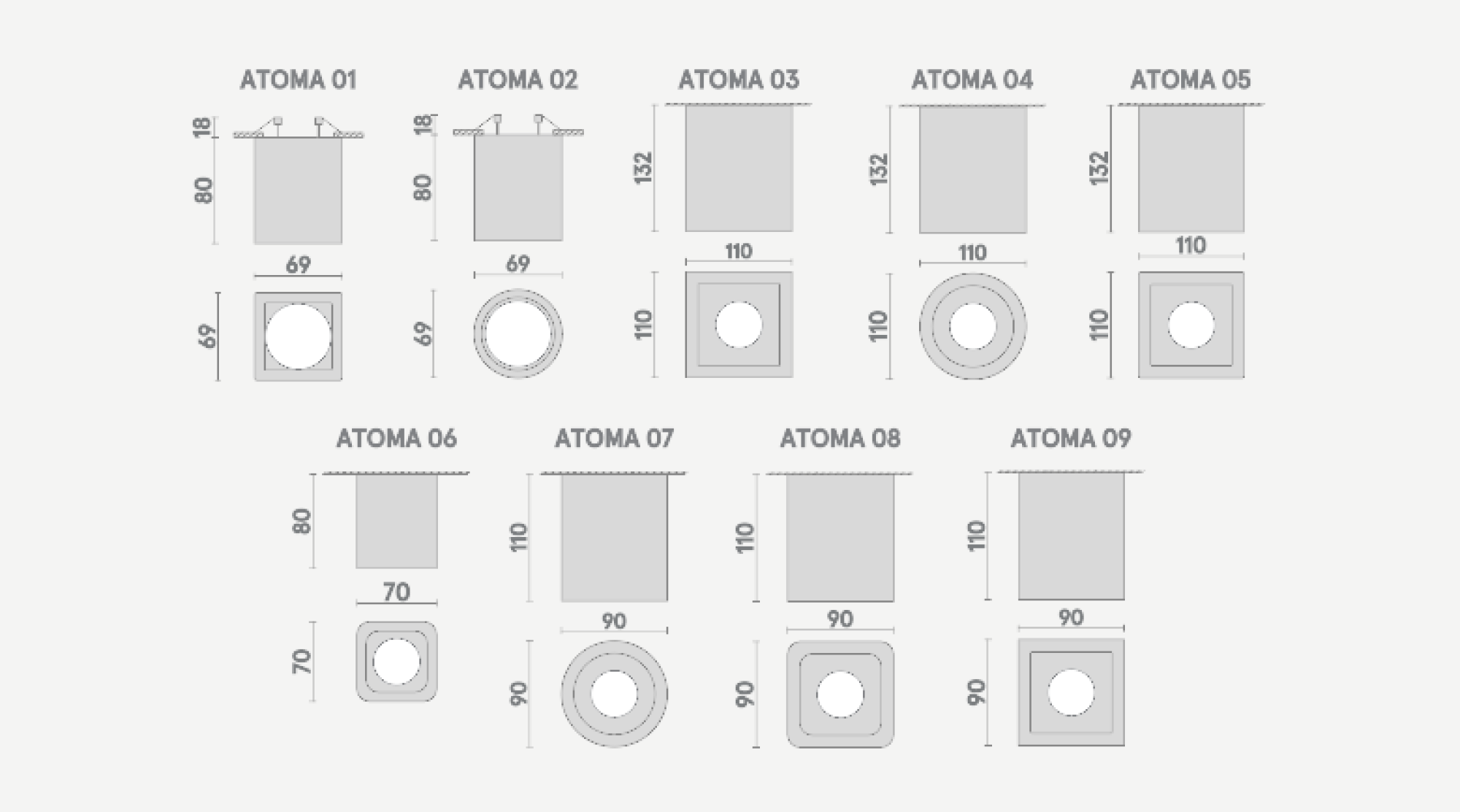 - ATOMA 06 – светильник кубической формы со скругленными ребрами. Тип: downlight (Источник света не утоплен в корпус светильника);