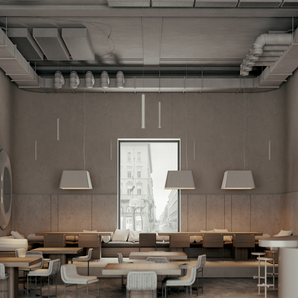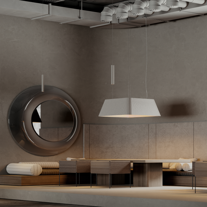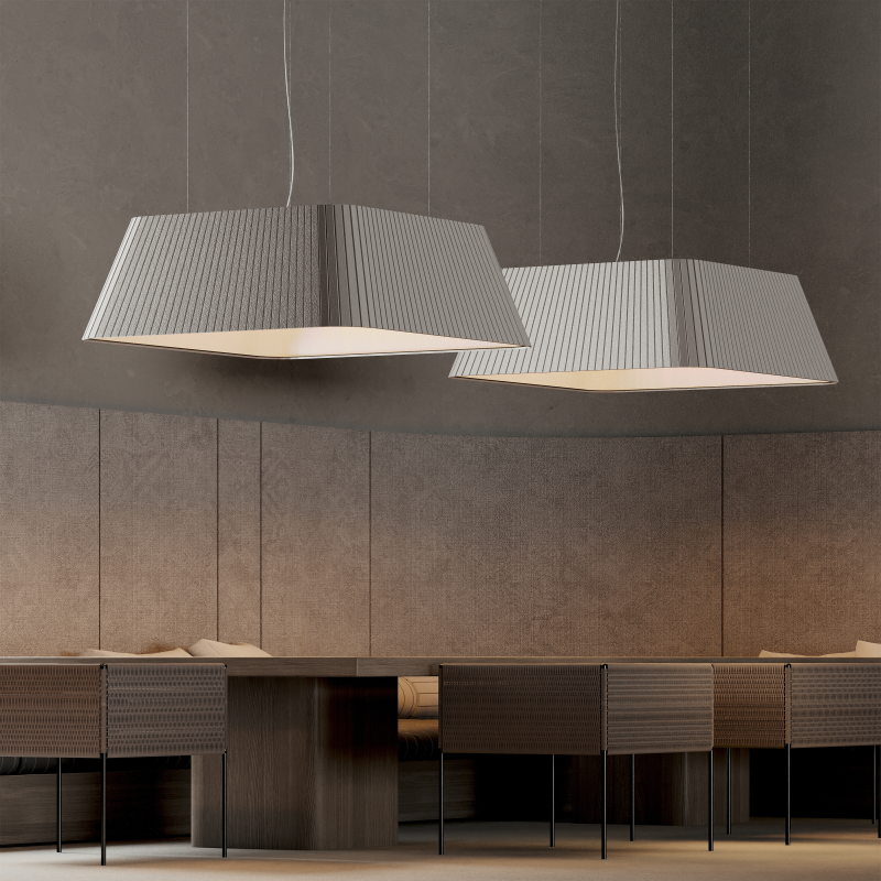 Акустические светодиодные светильники DORE ACOUSTIC торговой марки БОСМА. DORE ACOUSTIC – это функциональное освещение и звукопоглощение в цельной конструкции. Звукопоглощающая панель расположена над световой частью светильника.
