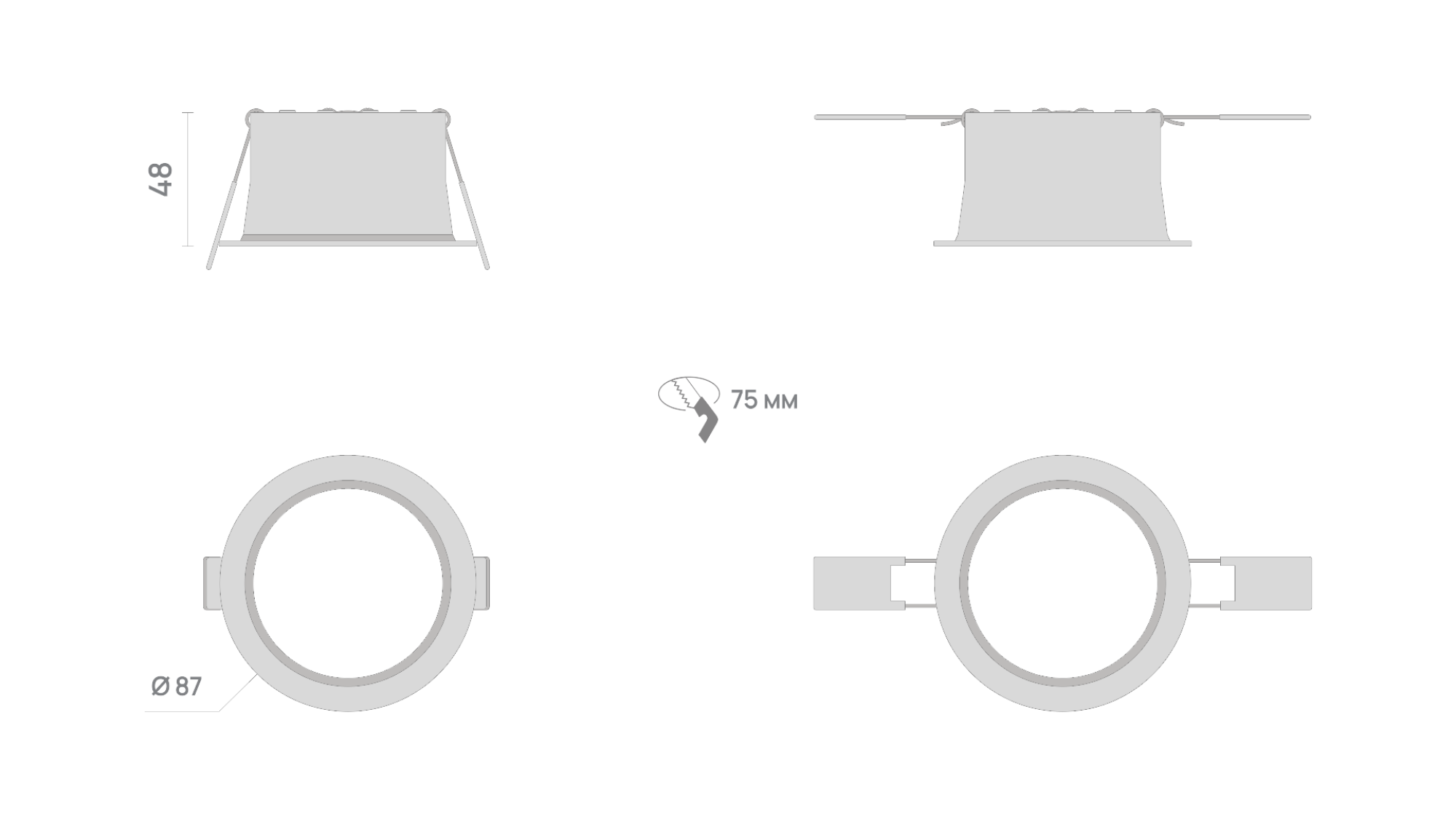 - Простота монтажа: врезное отверстие D75 мм, низкий корпус экономит запотолочное пространство.