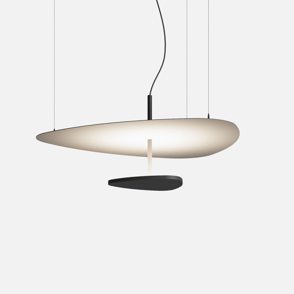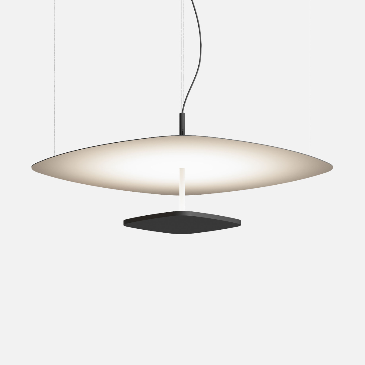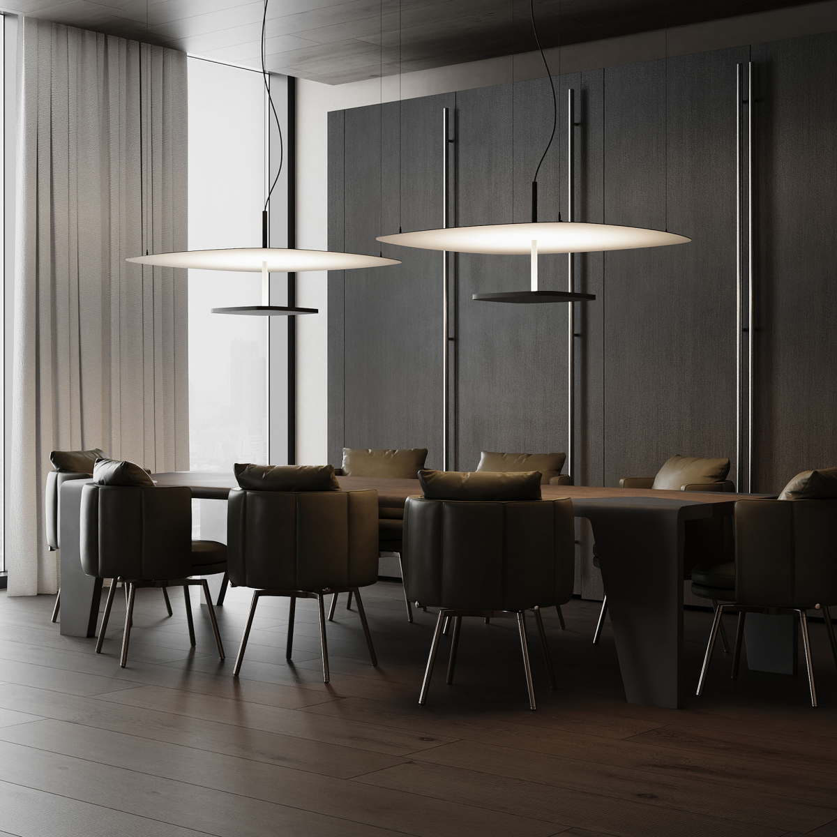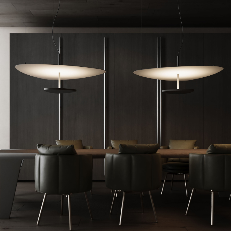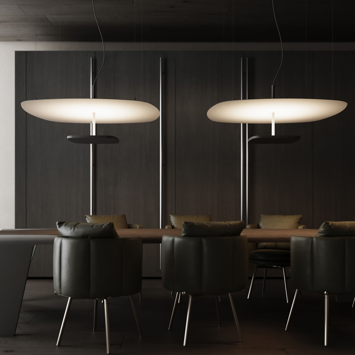 ELAN — светильник на отраженном свете, который создаёт тихую, по-настоящему комфортную атмосферу: свет мягко разливается по плоскостям, не слепит и помогает расслабиться, спокойно общаться или сосредоточенно работать. Его характер формирует крупный, выразительный отражатель ориентировочной шириной около 1200 мм: он собирает поток и направляет его к потолку и стенам, возвращая в пространство ровное,обволакивающее свечение без резких границ и контрастных бликов.