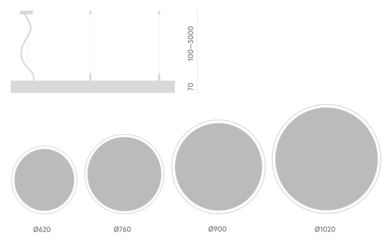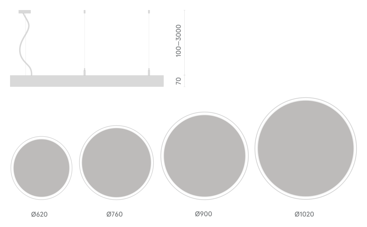 Большой выбор размеров — от компактных (d 1020 мм) до больших, с диаметром более двух метров, — позволяет находить решения для освещения любых помещений, в том числе крупногабаритных с высокими потолками. Светильники серии производятся с шириной корпуса 50 мм.
