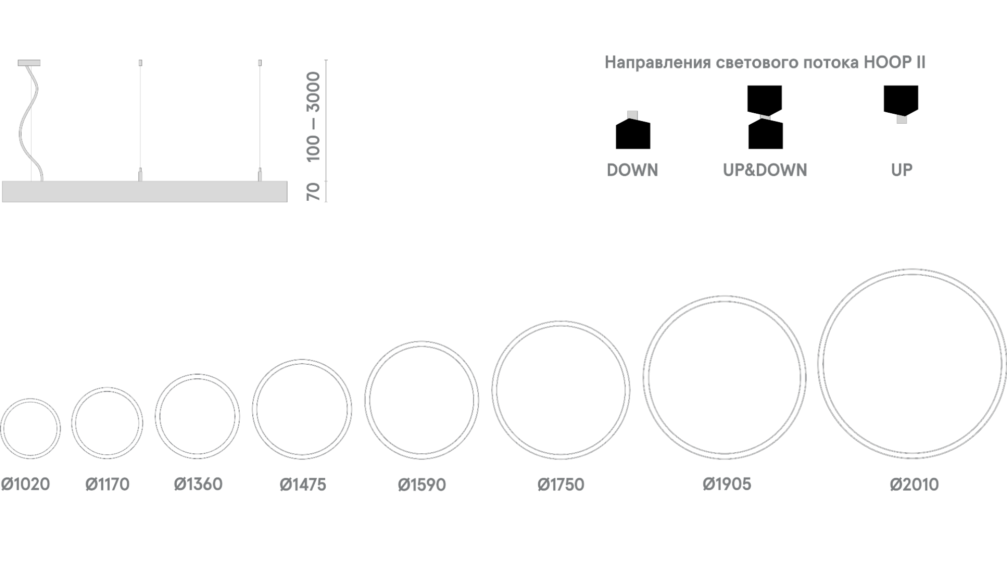 Большой выбор размеров — от компактных (d 1020 мм) до крупногабаритных, с диаметром более двух метров, — позволяет находить решения для освещения любых помещений, в том числе помещений с высокими потолками. Светильники серии производятся с шириной корпуса 50 мм.