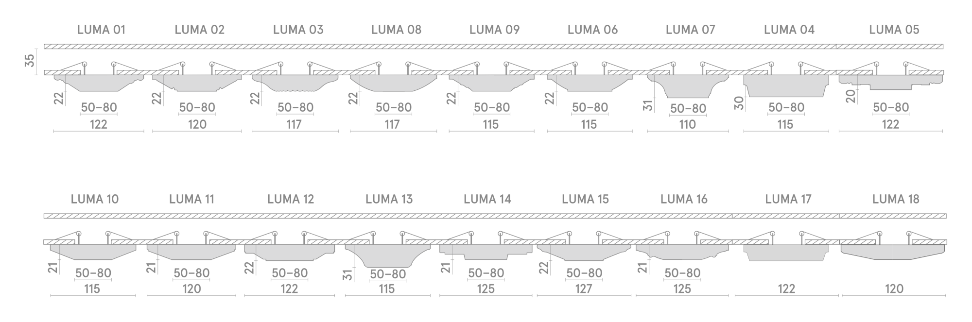 LUMA – серия встраиваемых потолочных светильников, изготовленных из гипсополимера, включающая в себя восемнадцать моделей: