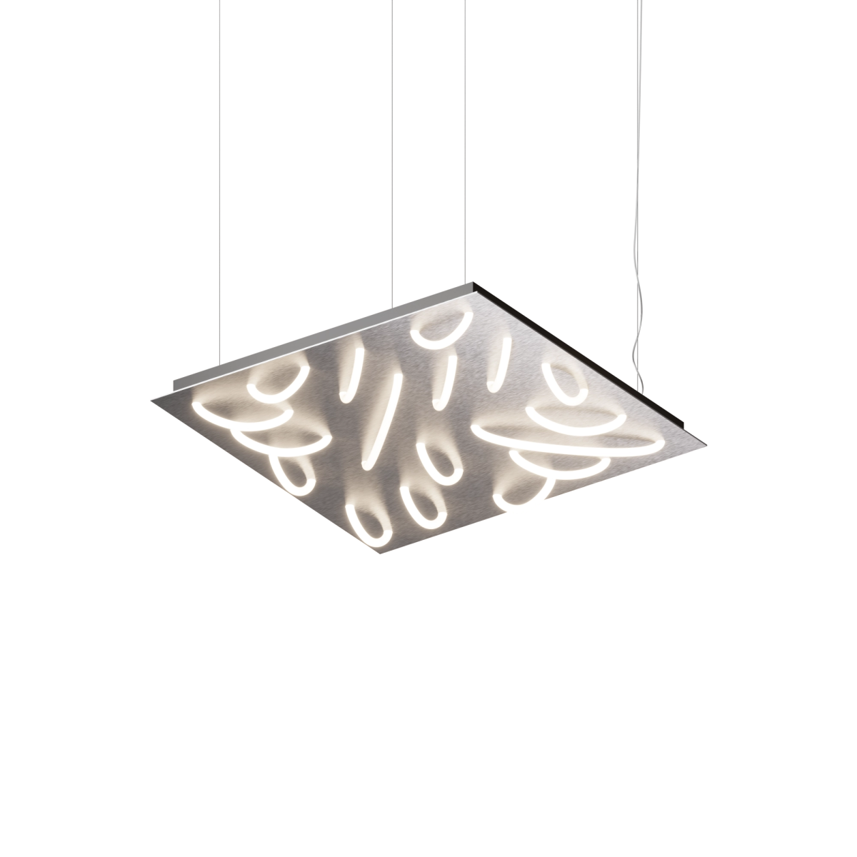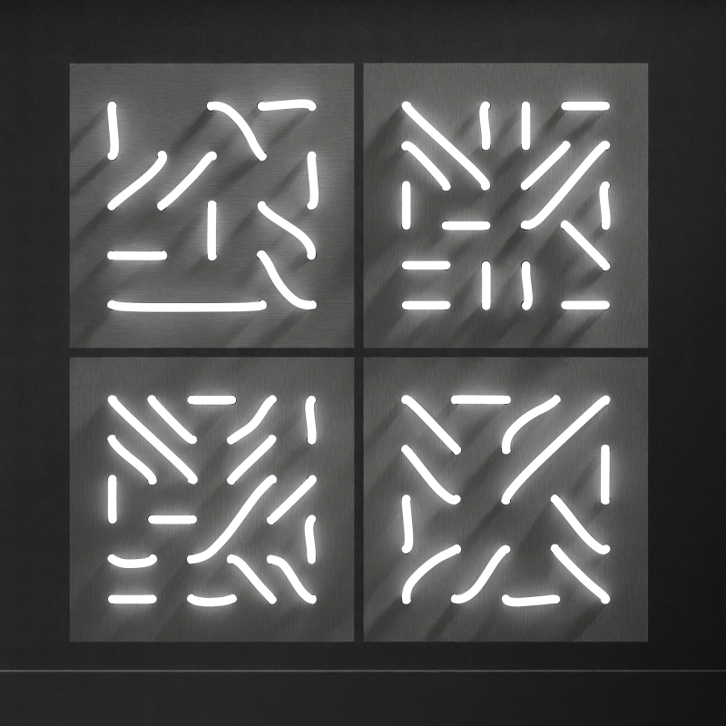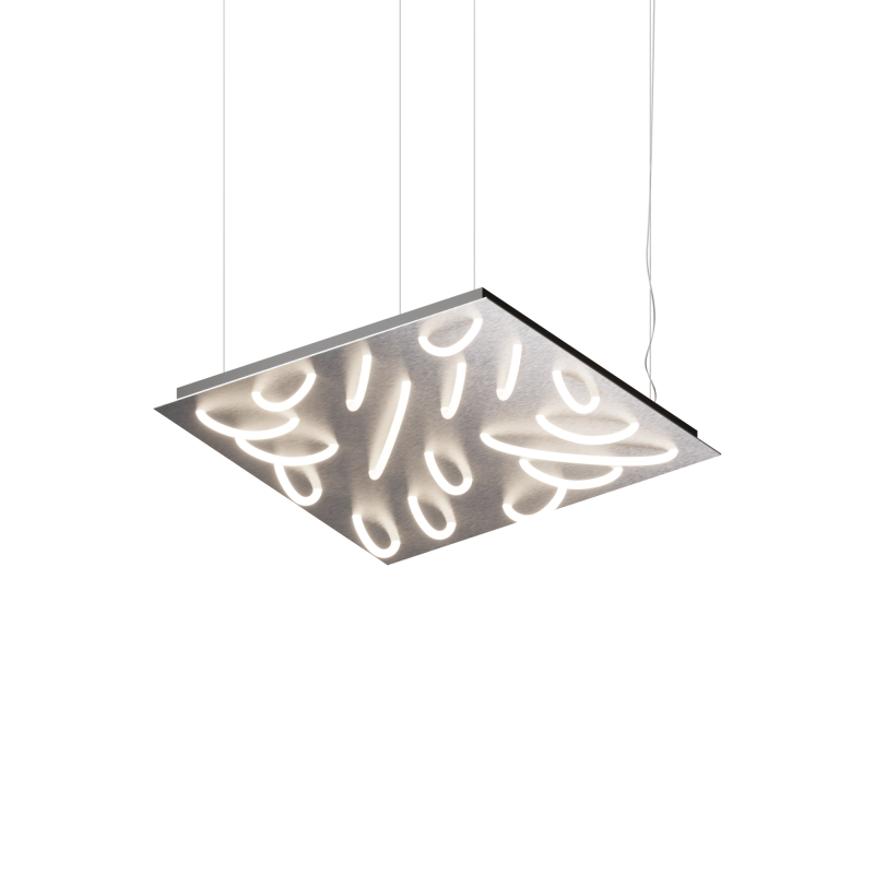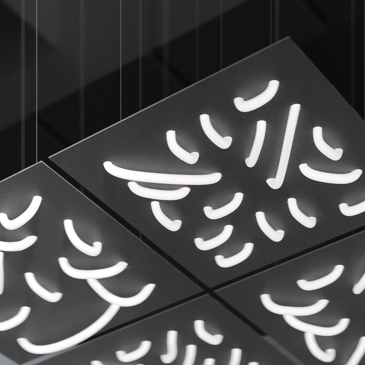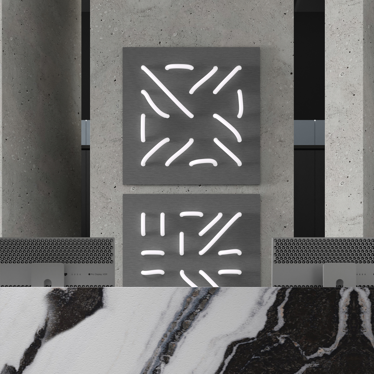 Световые линии, похожие на стежки, проходят сквозь лист брашированного алюминия и собираются в выразительную композицию, способную стать центральным акцентом пространства.