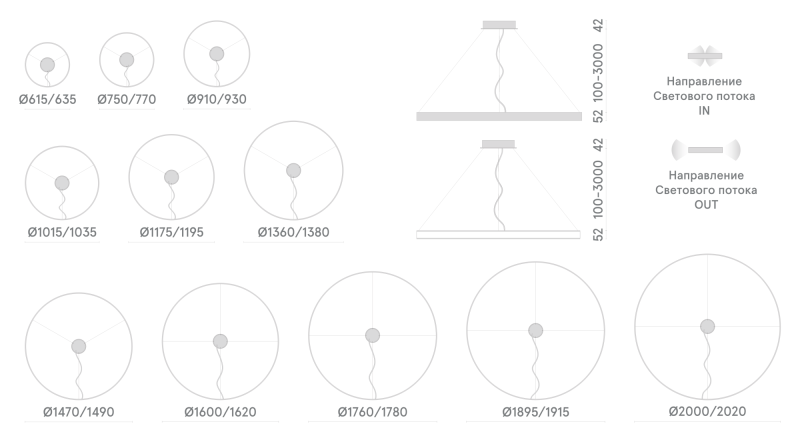В размерном ряду представлено 22 диаметра светильника от компактных (d 615 мм) до и крупногабаритных, с диаметром более двух метров, что позволит найти решение для освещения помещений с любой высотой потолка.