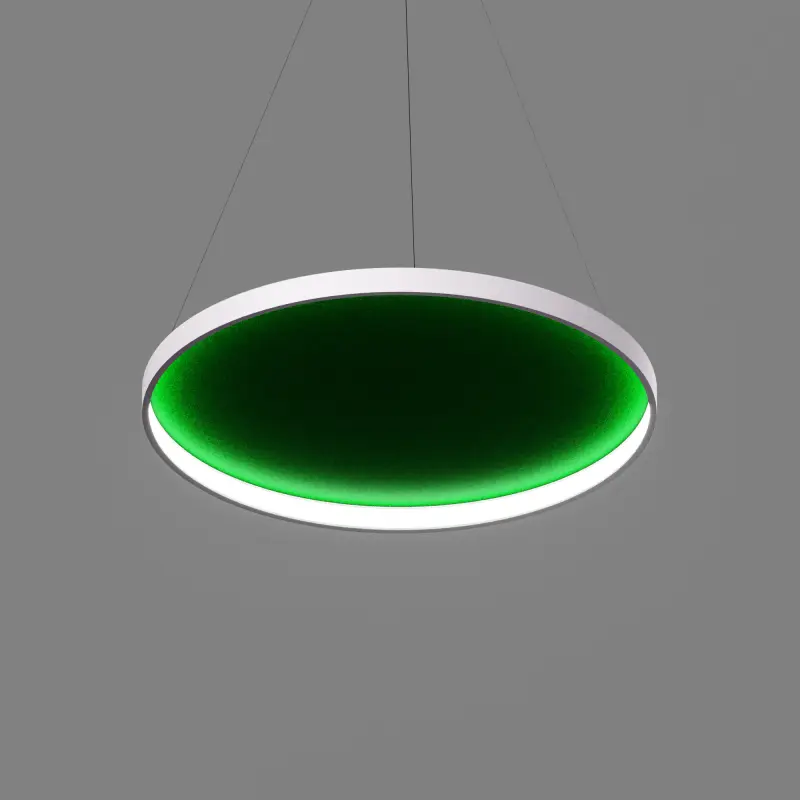 Светильник представляет собой плоское кольцо толщиной 14 мм и высотой 54 мм. Отличительная особенность моделей – декоративная панель, образующая верхнюю плоскость светильника. Доступные цвета корпуса/панели: белый/белый, черный/черный, белый/зеленый, черный/зеленый. Драйвер расположен в декоративном драйвер боксе, с помощью которого осуществляется крепление к плоскости потолка. Светильник поставляется с комплектом регулируемых подвесов.