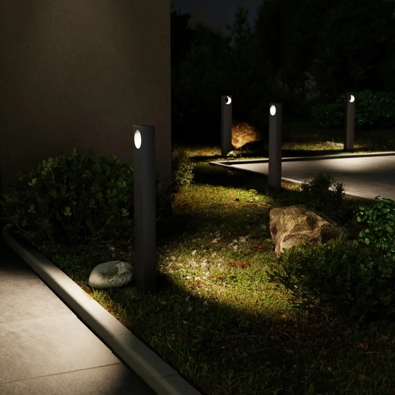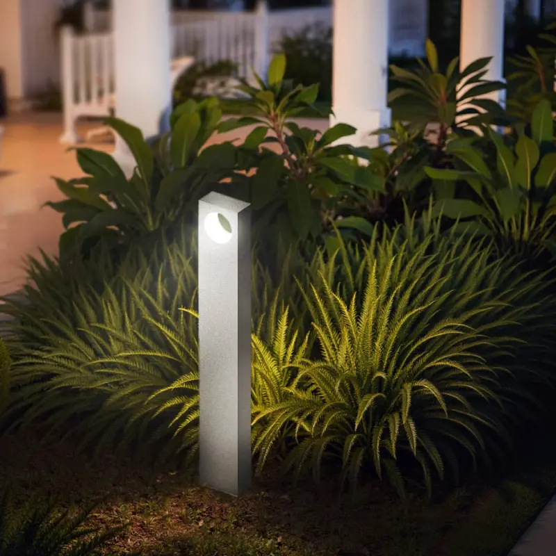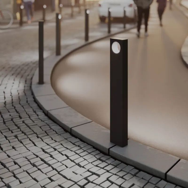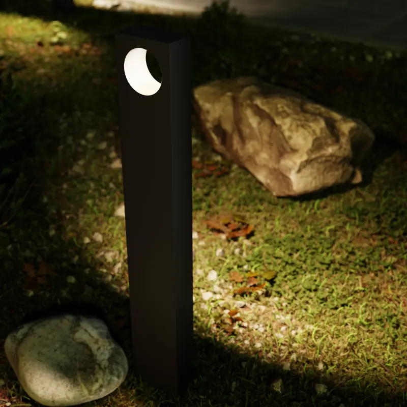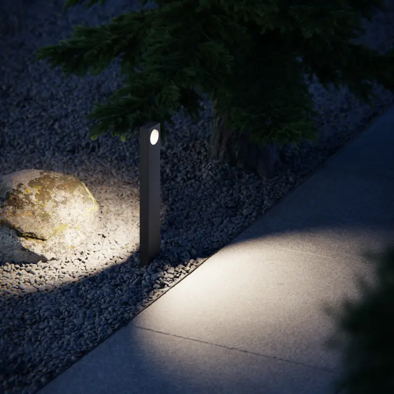 Прямоугольный корпус со сквозным круглым отверстием делает этот светильник узнаваемым и стильным элементом современного освещения. Но главная особенность — не только форма, а продуманная световая схема: свет падает сразу в двух направлениях, подчеркивая линии дорожек и освещая ландшафтные композиции.