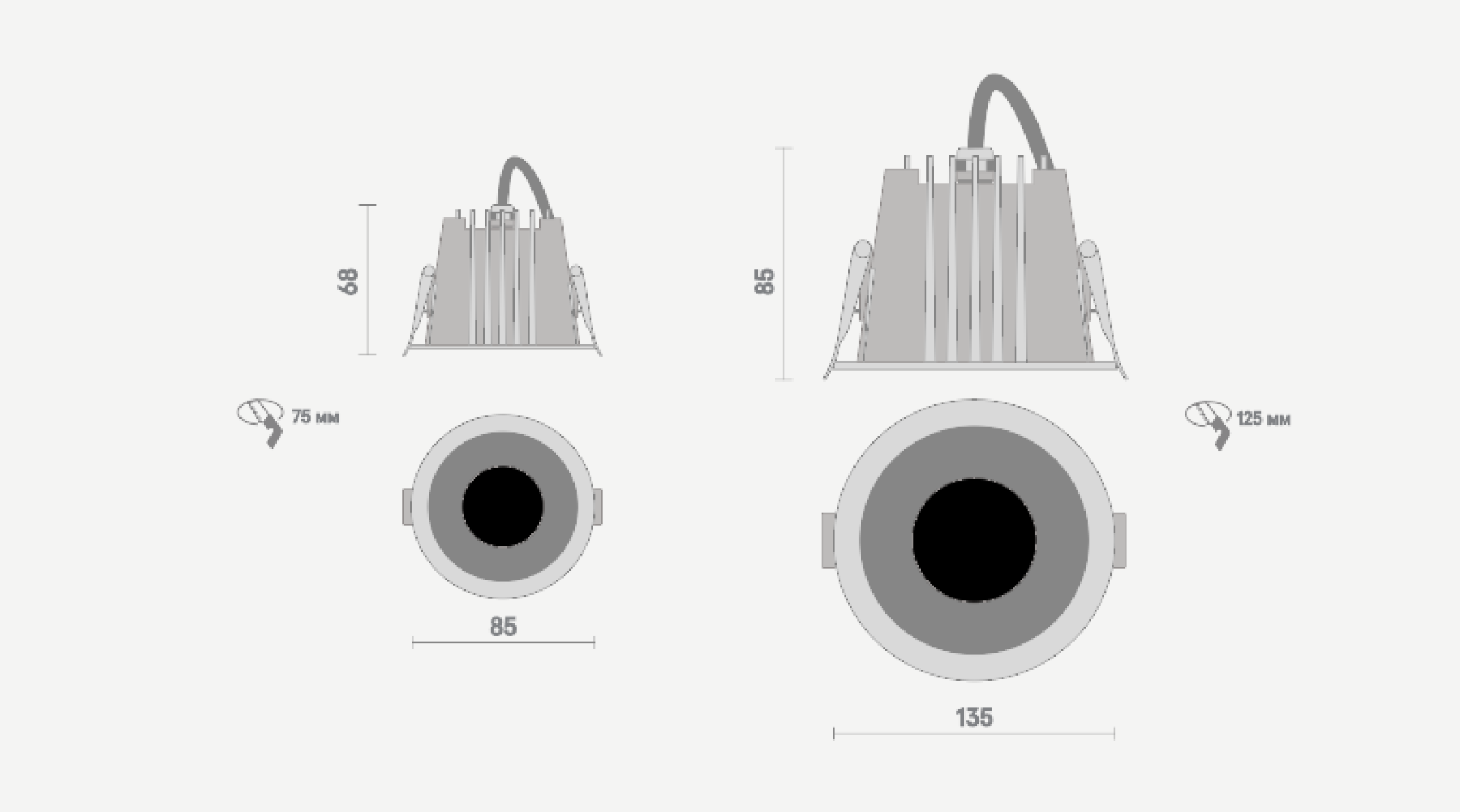 - Габариты: D85xH68мм, врезное отверстие D75мм, вес 0,46 кг / D135xH85мм, врезное отверстие D125мм, вес 0,72 кг
