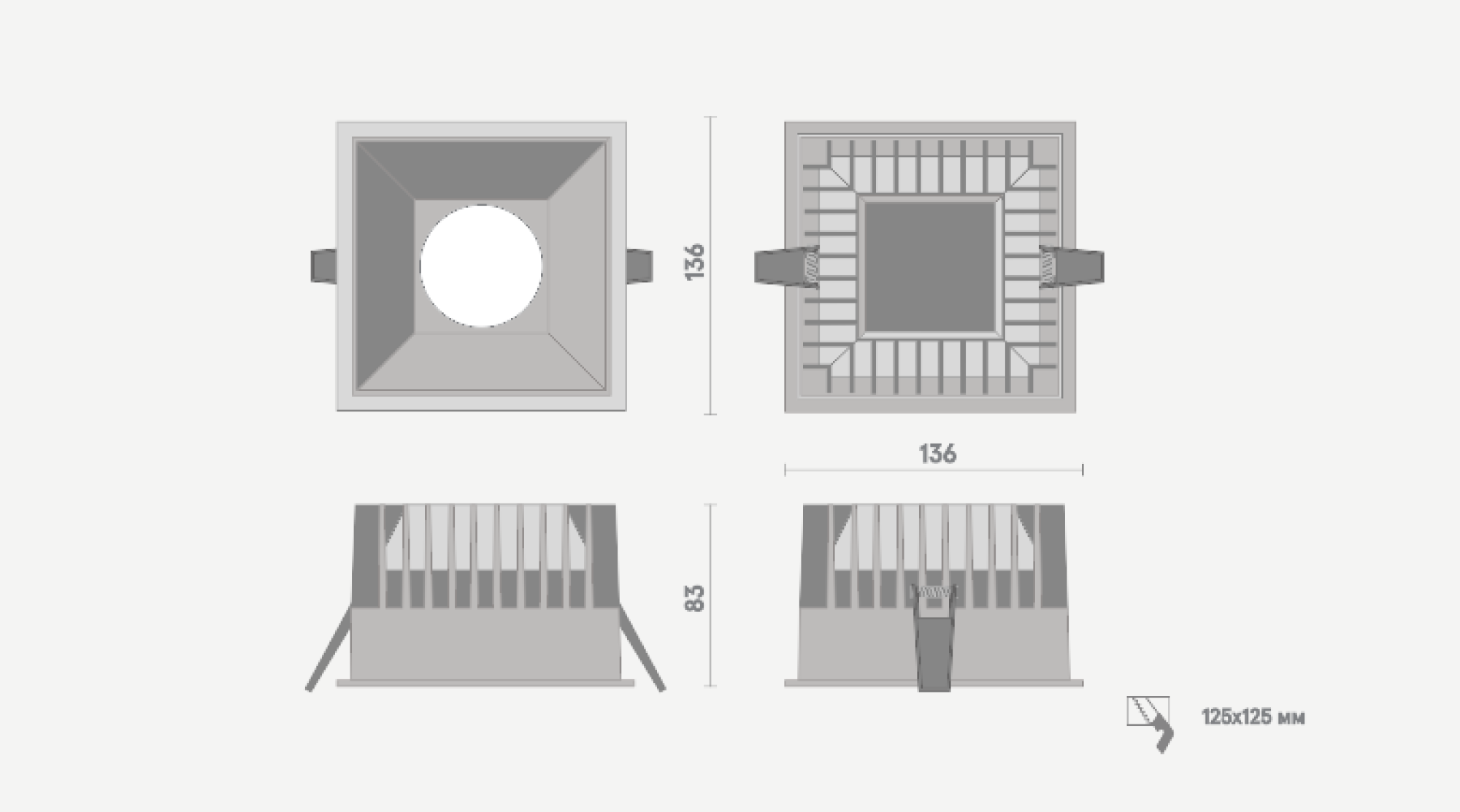 Материал корпуса светильника – алюминий. Корпус изготовлен методом литья. Обладает высокой степенью пылевлагозащиты (IP65). Возможна покраска внешней рамки в любой цвет по RAL. На выбор представлены четыре цвета отражателя: матовый черный, матовый белый, матовый золотой, матовый серебристый. Возможно диммирование DALI.