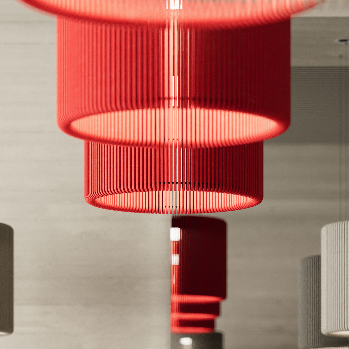 Светильник выполнен в цилиндрической форме и дополнен акустическим экраном из декоративного фетра, который размещается вокруг световой части. Такое решение помогает снижать уровень шума и формировать более комфортную атмосферу в помещении. Свет мягкий, равномерный и визуально комфортный, подходит как для рабочих пространств, так и для зон отдыха, ожидания и общения.