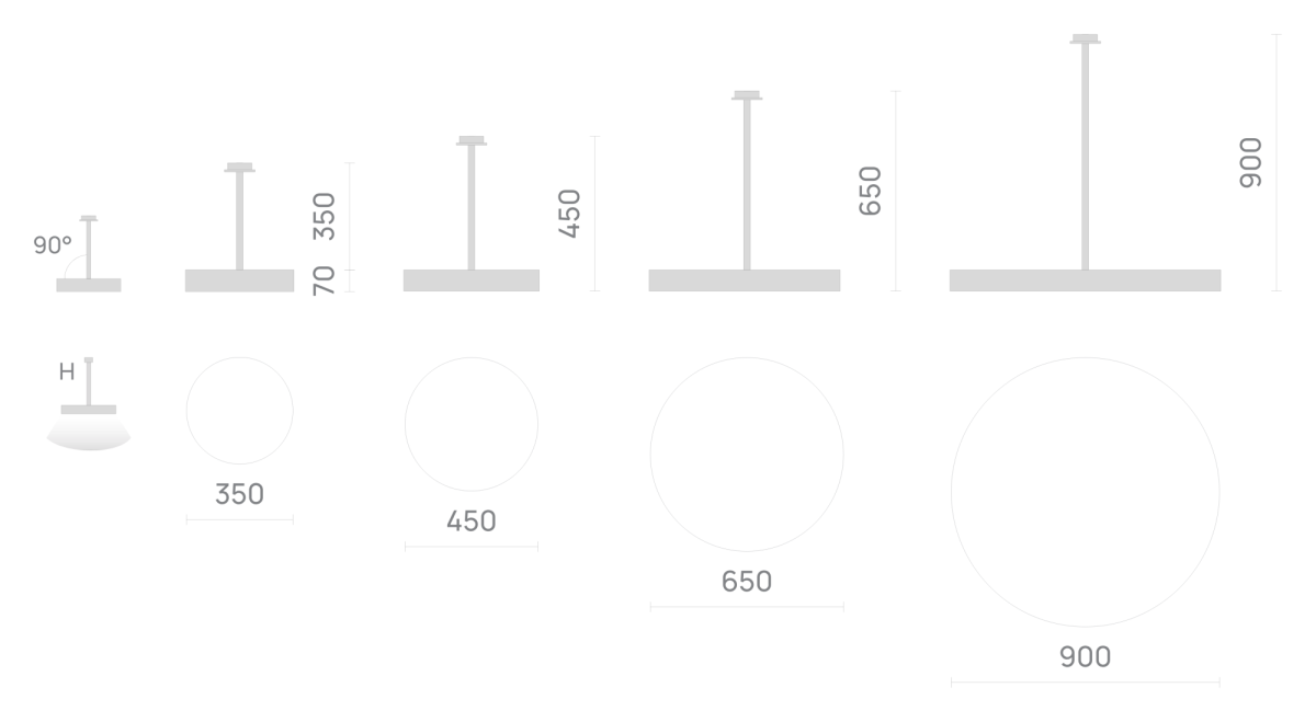 Серия включает две модификации светильника: с прямым расположением световой части и с расположением под 45 градусов. Стандартная длина подвеса светильника равна диаметру светильника. Возможно производство светильника RINGO H с удлиненным подвесом.