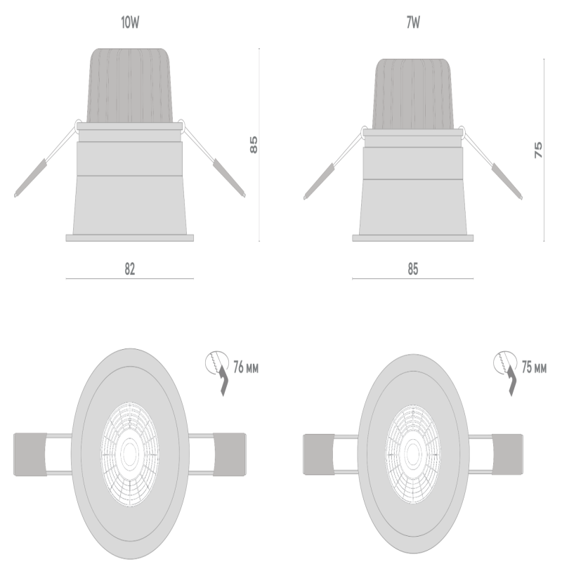 - 7 Вт / 600 Лм / 36˚ / IP54 с врезным отверстием 75 мм