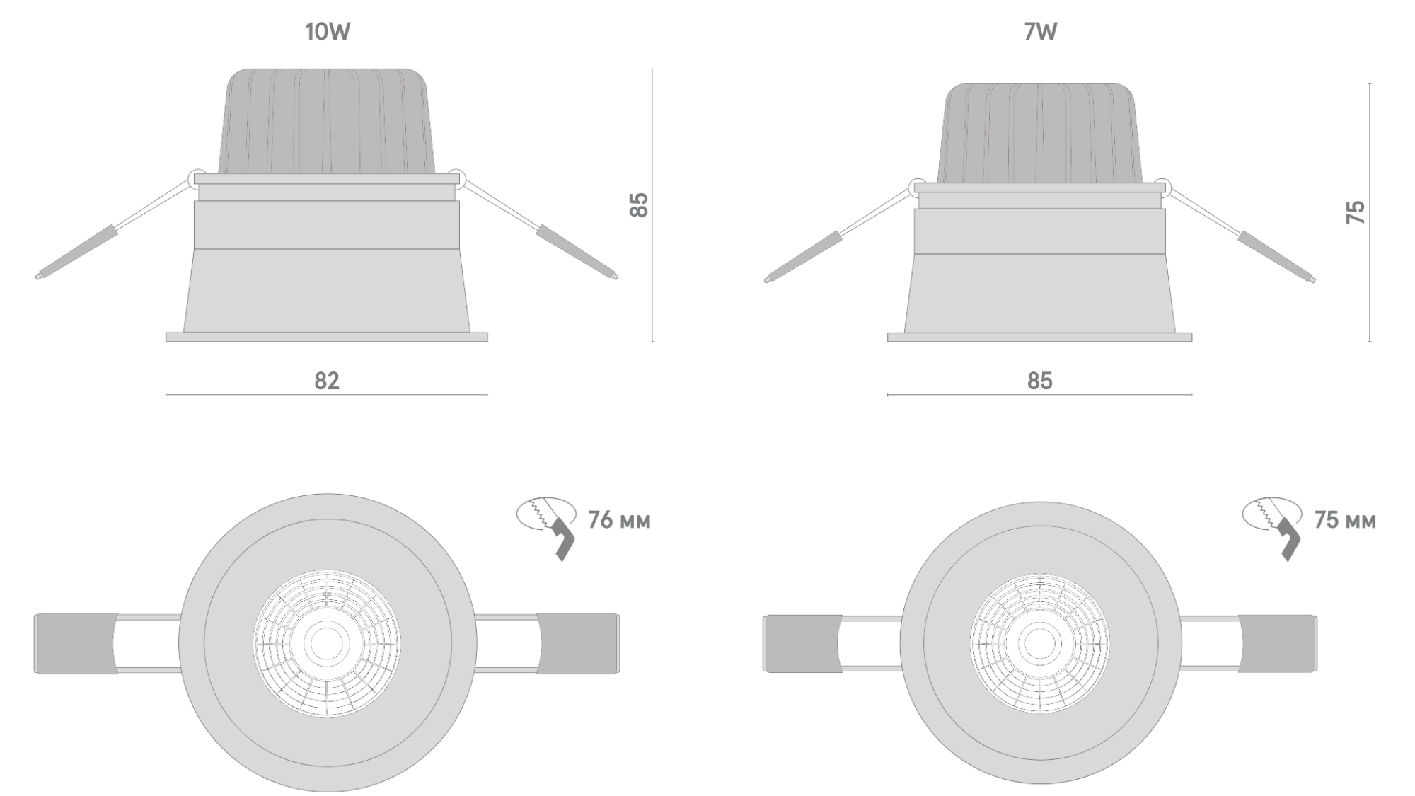 - 10 Вт / 850 Лм / 55˚ / IP54 с врезным отверстием 76 мм