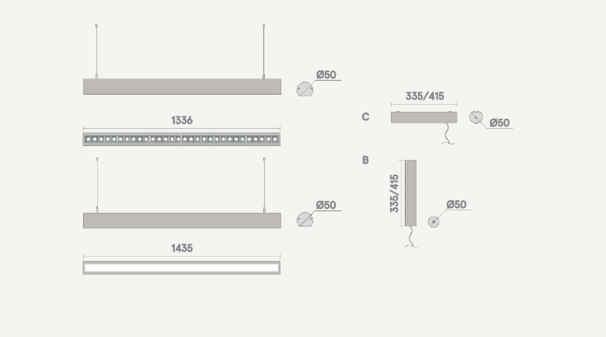 Сочетание разных световых элементов позволяет добиться равномерной и комфортной световой среды независимо от высоты потолка в помещении. Драйвер светильника может быть расположен в трех разных вариантах, в зависимости от требований проекта: в вертикальном цилиндрическом драйвер-боксе, в горизонтальном цилиндрическом драйвер-боксе или на удалении.