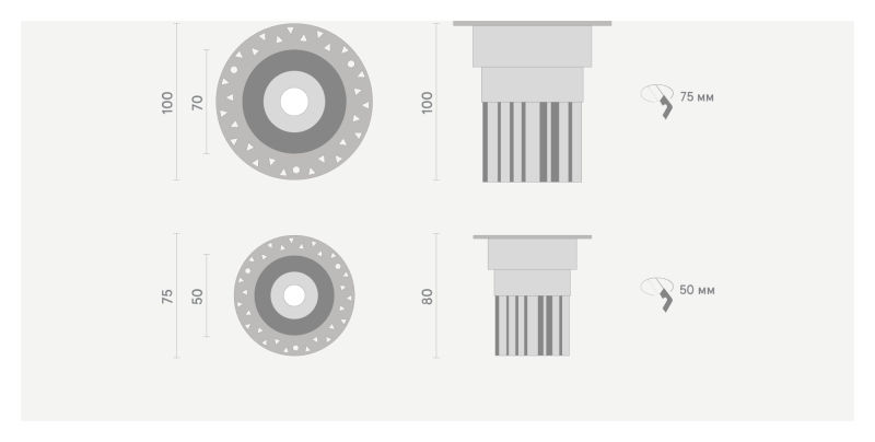 Габариты и вес: D50xH80мм, врезное отверстие D55мм, вес 0,25 кг; D70xH100мм, врезное отверстие D75мм, вес 0,45 кг.