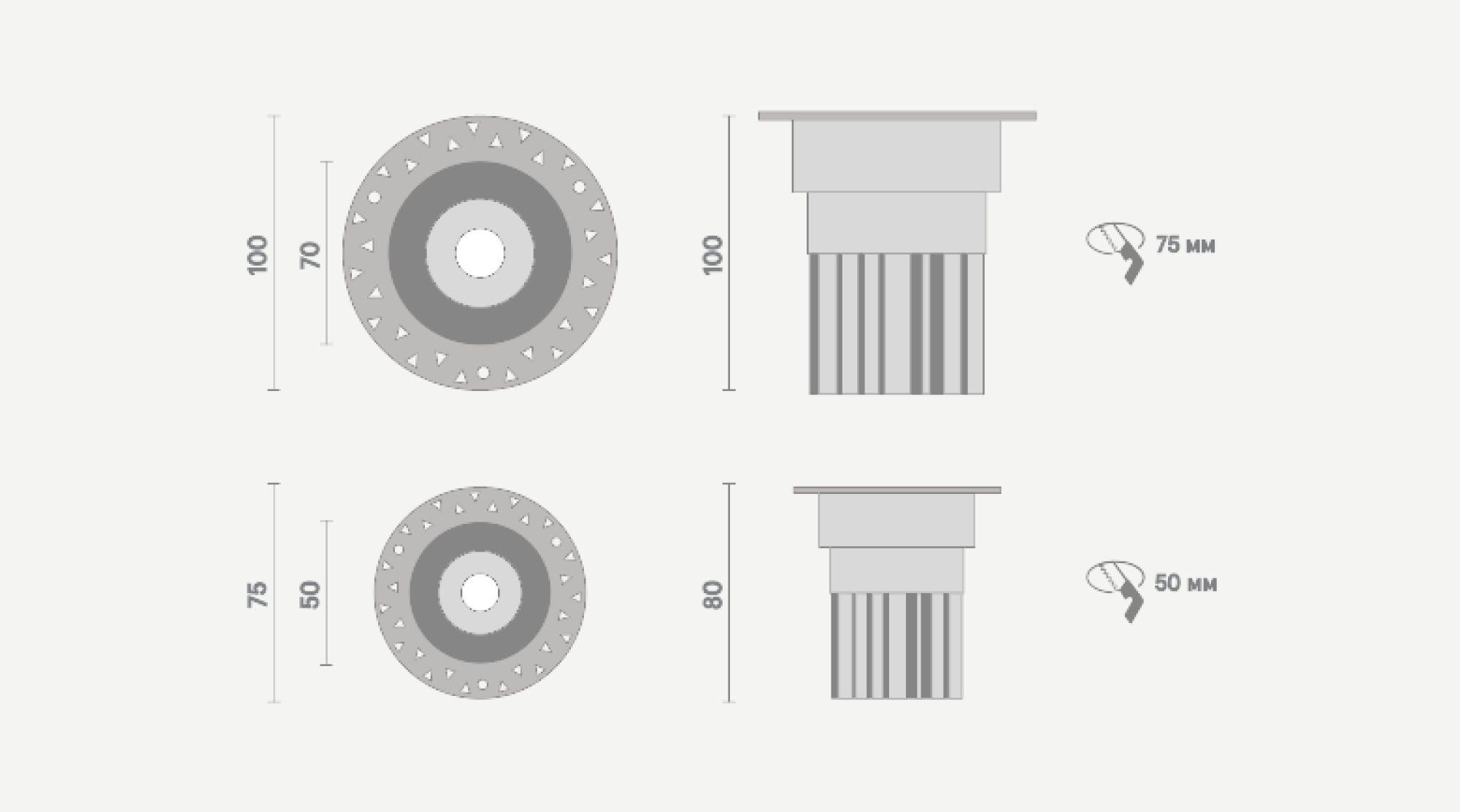 Габариты и вес: D50xH80мм, врезное отверстие D55мм, вес 0,25 кг; D70xH100мм, врезное отверстие D75мм, вес 0,45 кг.