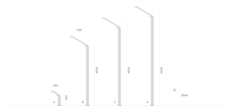RUA 140 – светильники изогнутой формы с цилиндрическим профилем и боковой засветкой. Голова светильника расположена под углом 45˚ к основанию.
