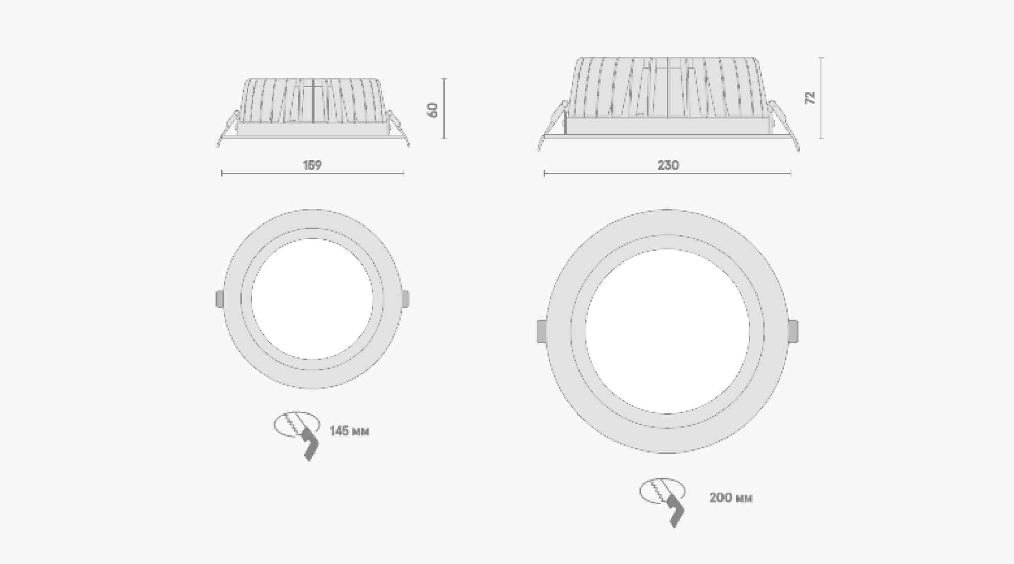 24-36W: 230x72мм (врезное отверстие 200мм)