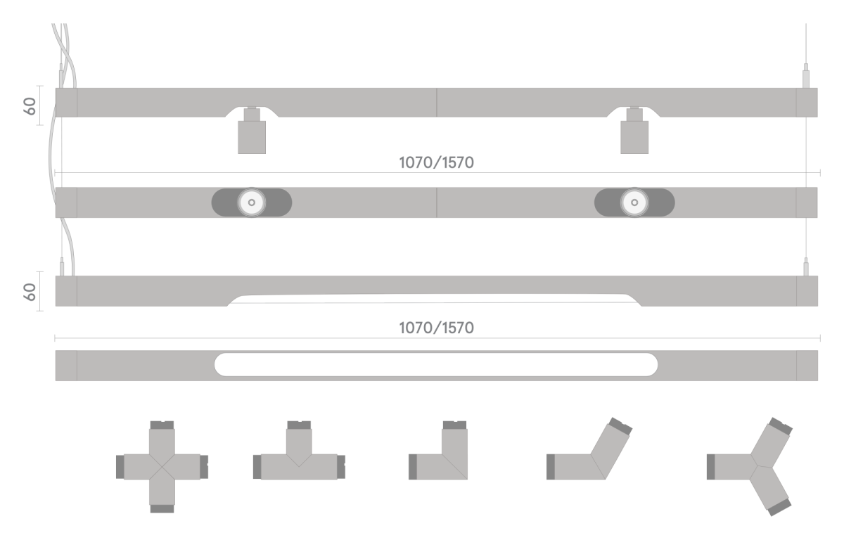 Сборка системы светильника TRU-BAT осуществляется с помощью специальных соединителей (Y/L/T/X/I-образных).