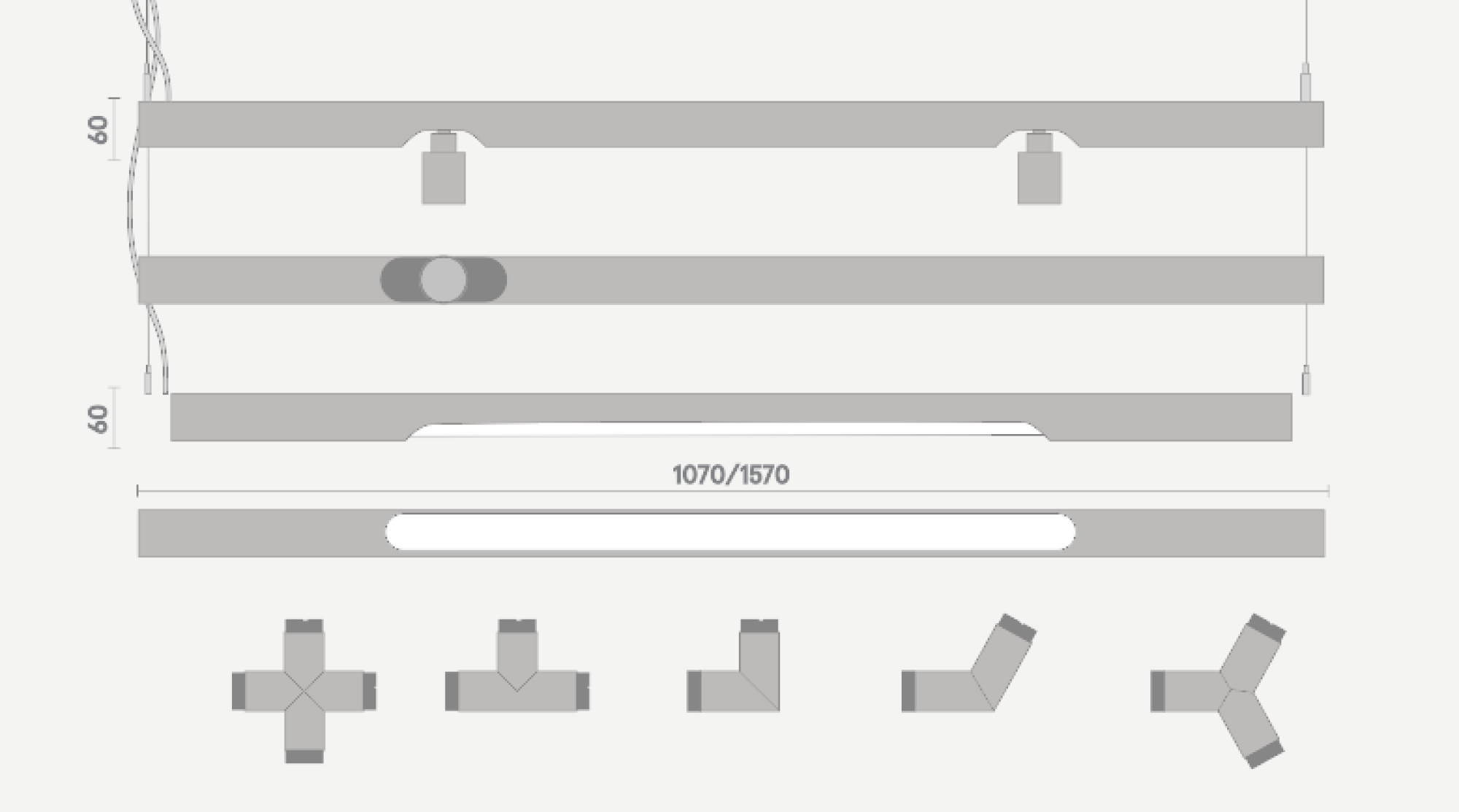 Сборка системы светильника TRU-BAT осуществляется с помощью специальных соединителей (Y/L/T/X/I-образных).