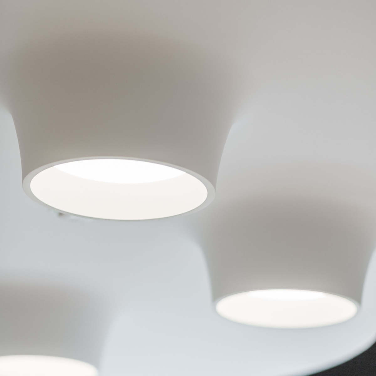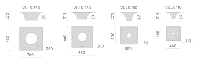 Модели гипсовых светильников, интегрируемых в гипсокартонный потолок или стены, имеют светодиодные источники света (LED), утопленные в корпус, что исключает эффект ослепления при самых широких углах обзора. Модельный ряд VULK представлен несколькими типоразмерами гипсовых светильников под покраску диаметром: 110, 150, 280, 380, так же возможно изготовление в размере 900, 1700