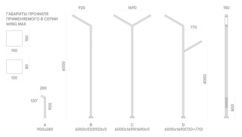 Светильники WING MAX имеют простую геометрическую форму: Г-образную, Т-образную и Z-образную. Головы расположены под углом к основанию.
