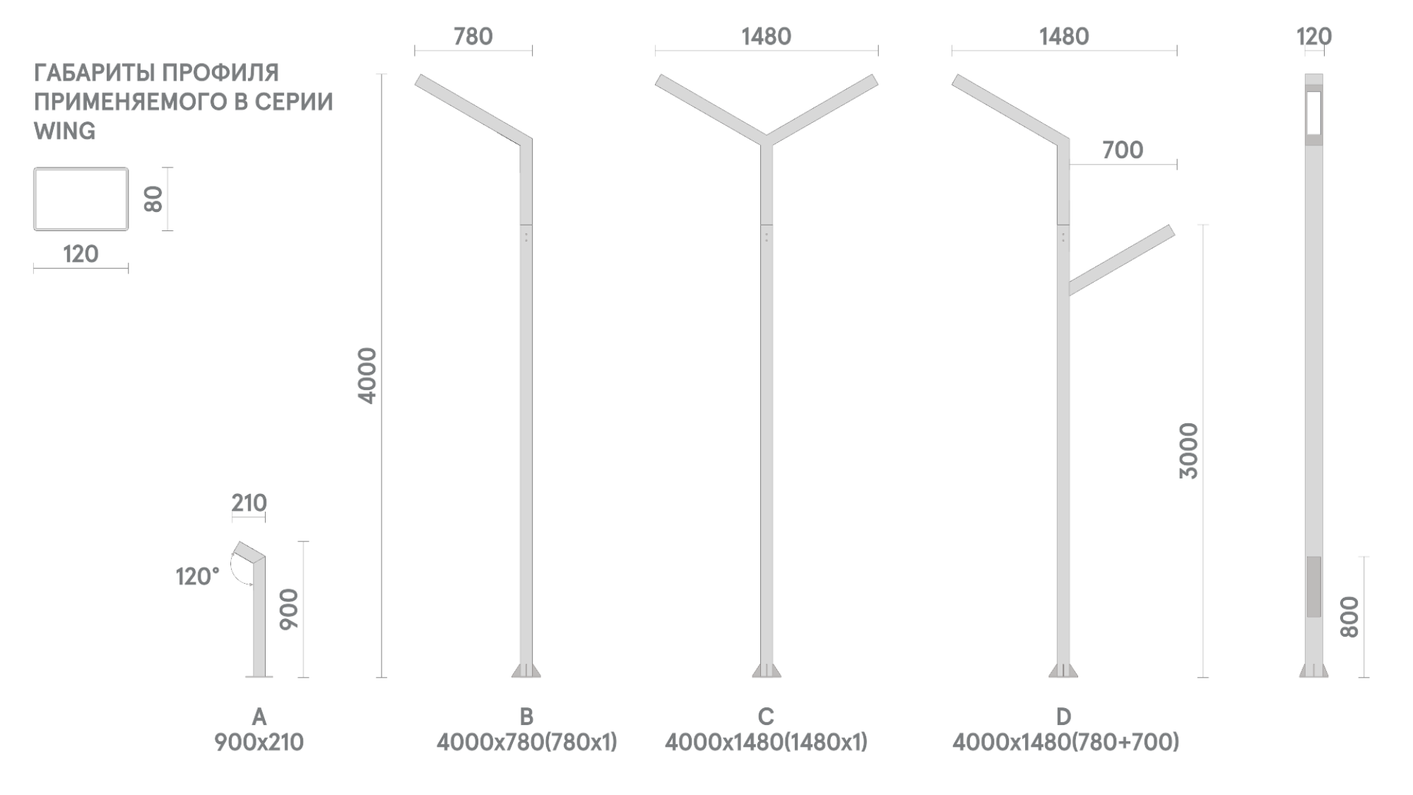 Светильники WING имеют простую геометрическую форму: Г-образную, Т-образную и Z-образную. Головы расположены под углом к основанию.