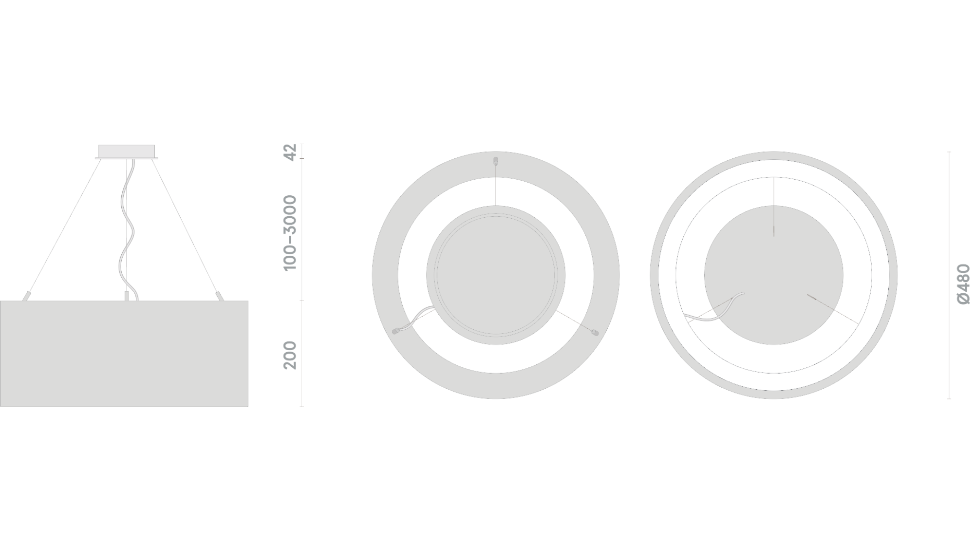Корпус светильника выполнен из алюминия и окрашен порошковой краской. Драйвер расположен в декоративном драйвер боксе, с помощью которого осуществляется крепление к плоскости потолка. Светильник поставляется с комплектом регулируемых подвесов.