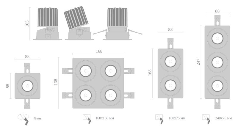 Материал корпуса – алюминий. Изготовлен методом литья. Сотовый блокиратор в светильники снижает общий показатель дискомфорта (UGR).На выбор представлены четыре типа корпусов: квадрат (одиночный), два и три светильника прямоугольной формы, квадрат из четырех моделей. Доступны четыре цвета внутреннего кольца на выбор: матовый черный, матовый белый, глянцевое золото, глянцевый хром.