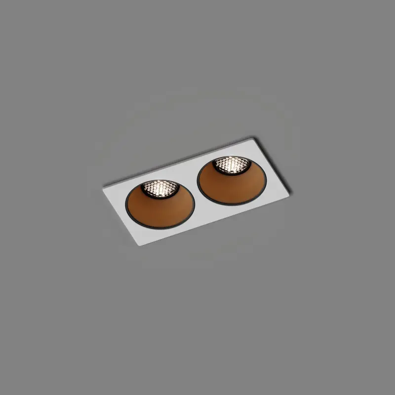 Материал корпуса – алюминий. Изготовлен методом литья. Сотовый блокиратор в светильники снижает общий показатель дискомфорта (UGR).На выбор представлены четыре типа корпусов: квадрат (одиночный), два и три светильника прямоугольной формы, квадрат из четырех моделей. Доступны четыре цвета внутреннего кольца на выбор: матовый черный, матовый белый, глянцевое золото, глянцевый хром.