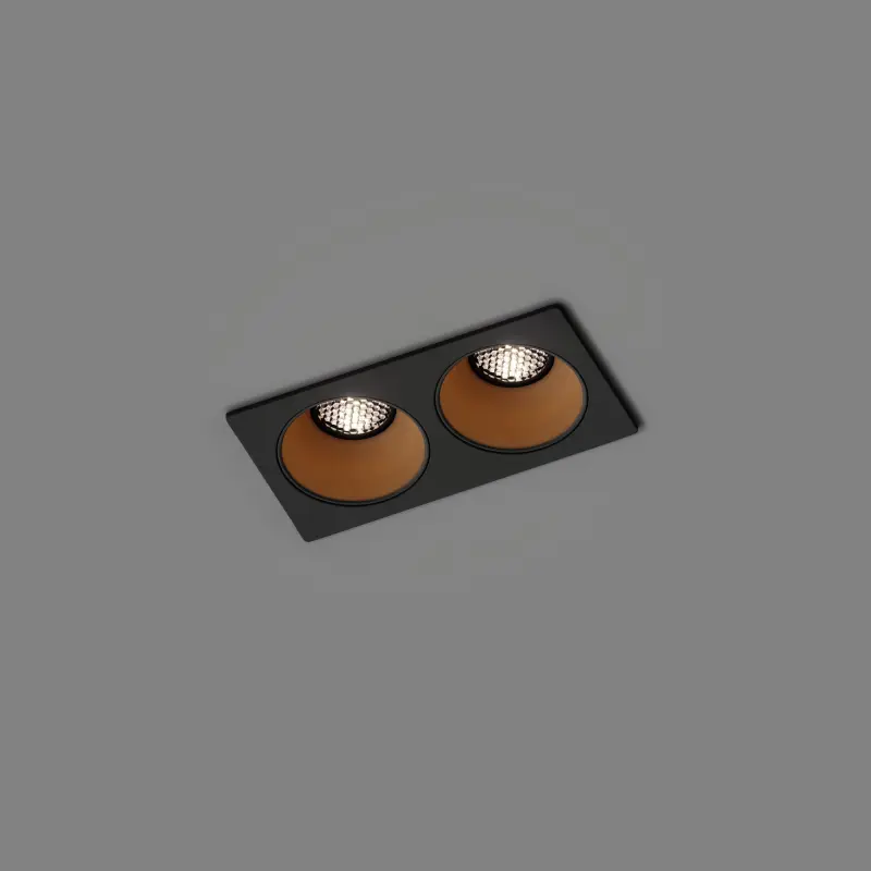 Материал корпуса – алюминий. Изготовлен методом литья. Сотовый блокиратор в светильники снижает общий показатель дискомфорта (UGR).На выбор представлены четыре типа корпусов: квадрат (одиночный), два и три светильника прямоугольной формы, квадрат из четырех моделей. Доступны четыре цвета внутреннего кольца на выбор: матовый черный, матовый белый, глянцевое золото, глянцевый хром.
