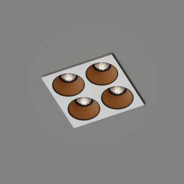 Материал корпуса – алюминий. Изготовлен методом литья. Сотовый блокиратор в светильники снижает общий показатель дискомфорта (UGR).На выбор представлены четыре типа корпусов: квадрат (одиночный), два и три светильника прямоугольной формы, квадрат из четырех моделей. Доступны четыре цвета внутреннего кольца на выбор: матовый черный, матовый белый, глянцевое золото, глянцевый хром.