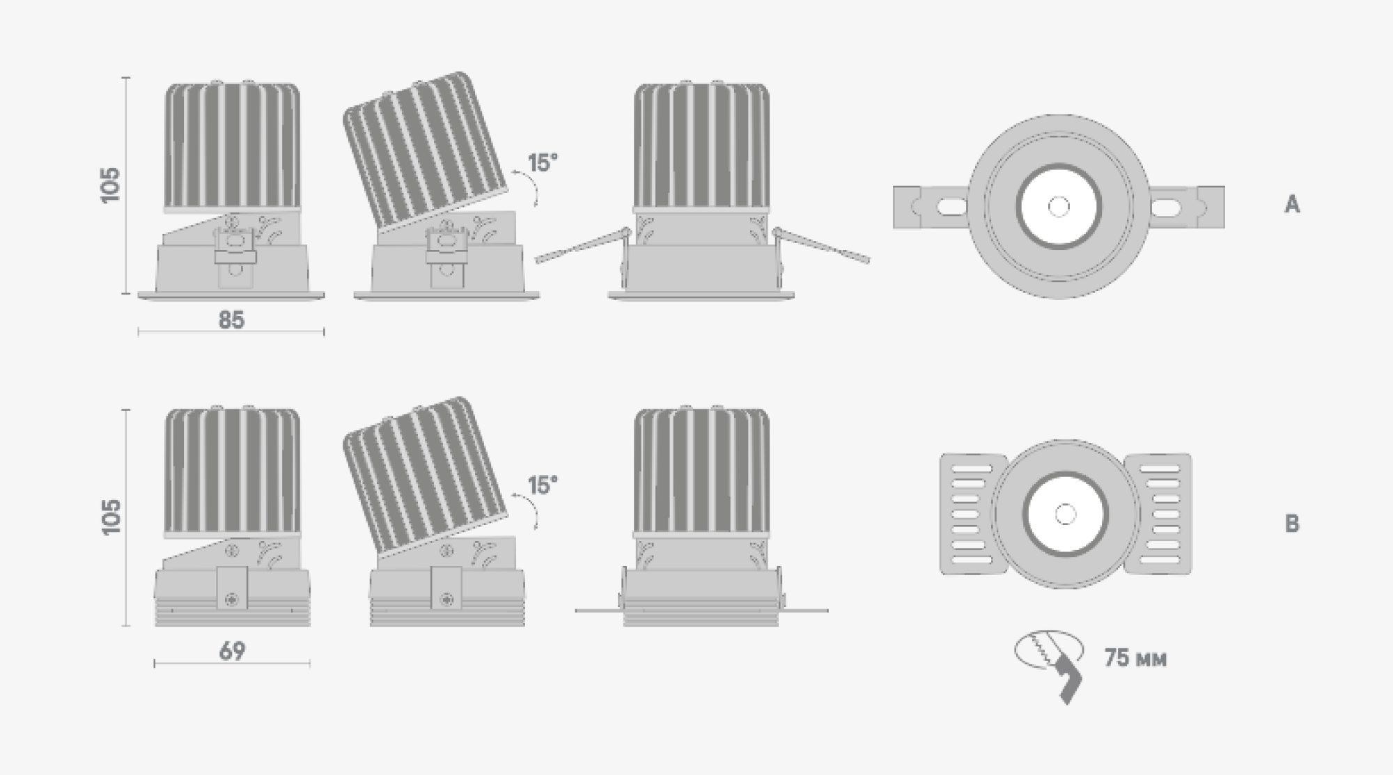 - Модификация B – D69xH105мм, врезное отверстие D75мм, вес 0,430кг.