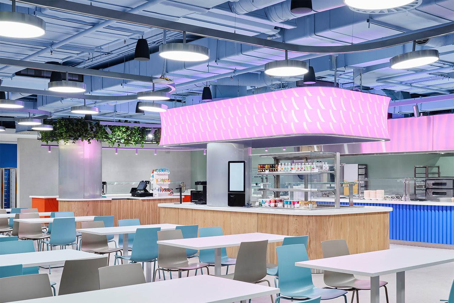 Композиционным и визуальным центром пространства стал остров салат-бара вокруг колонны, над которым размещена световая инсталляция с тканевым рассеивателем и линейной системой WAVE 4000К, объединяющая декоративный эффект и равномерное функциональное освещение. По периметру над фуд-стойками применена подвесная система с RUNIC 60 в гнутой трубе, формирующая акцентный свет рабочих зон и подчёркивающая пластику потолка. Общее освещение зала реализовано светильниками RINGO на жёстком подвесе: они обеспечивают стабильный направленный свет и структурируют пространство при открытых инженерных коммуникациях. В зонах с диванами использован встроенный световой потолок на базе RINGO MAX для мягкого рассеянного освещения, а в кабинках — RINGO HIGH ACOUSTIC в металлических абажурах, создающие локальный визуальный комфорт и спокойную атмосферу.