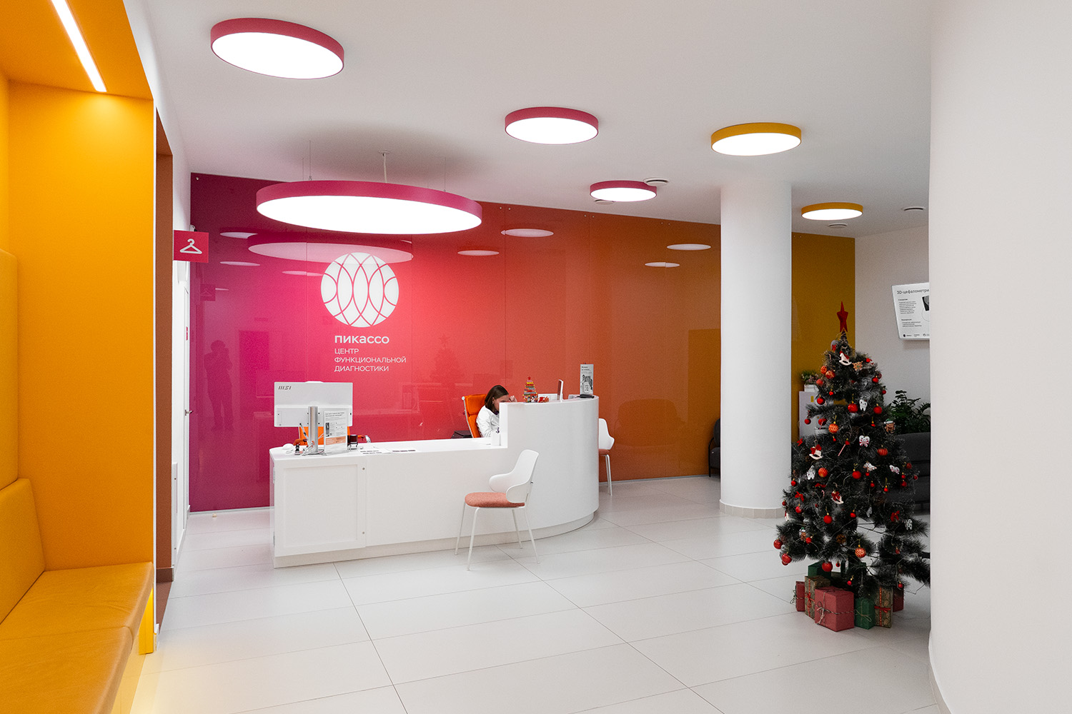 Федеральная сеть независимых центров рентгенодиагностики «Пикассо» — это современные медицинские пространства, объединённые единым стандартом технологичности, эргономики и визуального комфорта. В центре на проспекте Вернадского компания МДМ-ЛАЙТ поставку освещения с акцентами фирменной цветовой гаммы сети — от фиолетового и розового до оранжевого и жёлтого.