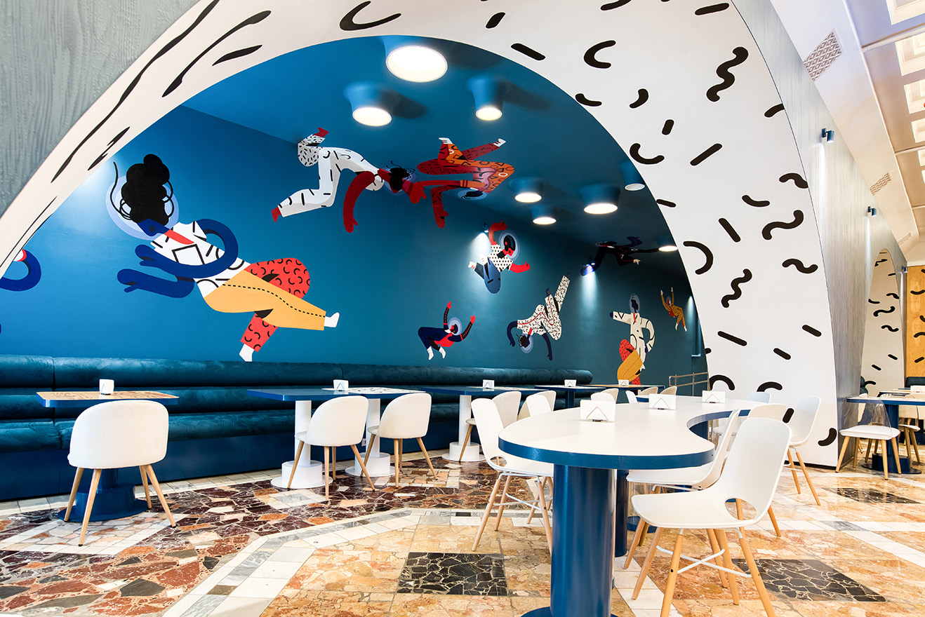 Космическим светильникам VULK —соответствующий интерьер! А где такой интерьер? В кафе «Космос», расположенного в центре «Космонавтика и авиация» на ВДНХ! Дизайн необычного кафе был разработан бюро Sundukovy Sisters. Им свойственны такие сильные образы. В кафе есть сразу всё: и насыщенные цвета, и яркие забавные принты, и большие тематические фигуры, - аттракторы для любящих селфи. Светильники VULK расположились на синем, как небо фоне. Картину дополняют стилизованные космонавты, нанесенные на синий фон легкой рукой художника.