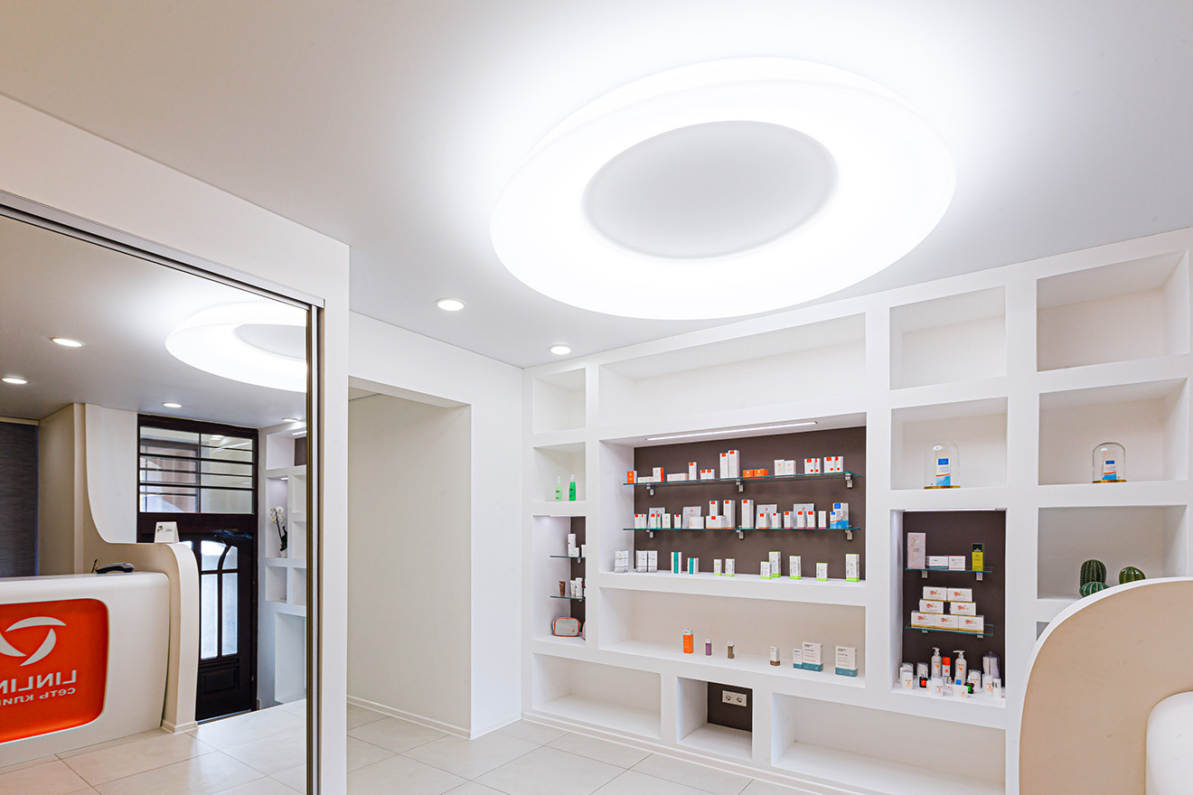 Посещение клиники косметологии и пластической хирургии всегда волнительно, поэтому окружающая обстановка в клинике должны быть уютная и комфортная. Для комфортного освещения общественных зон и процедурных кабинетов были выбраны светильники c матовым рассеивателем и широким светораспределением: STRELA и NIMB.