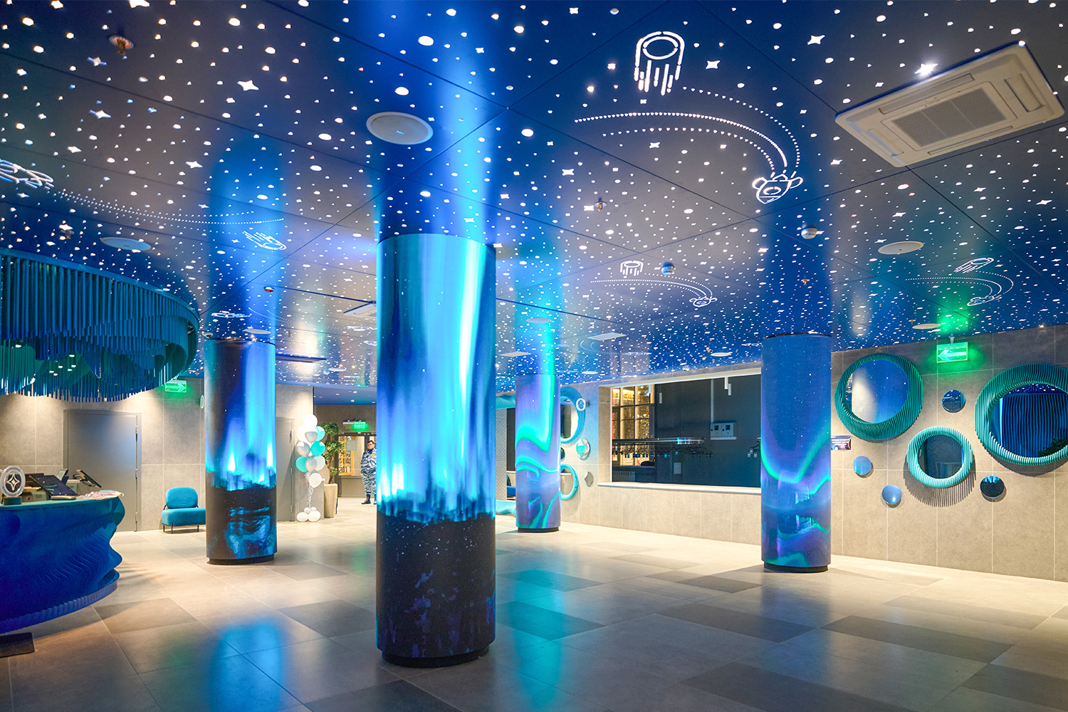 Комплексное интерьерное освещение спроектировано и реализовано компанией МДМ-ЛАЙТ. В общественных зонах применена индивидуальная скрытая система, интегрированная в металлические потолки и колонны с художественной перфорацией, формирующая равномерную фоновую засветку и подчёркивающая архитектурную графику. В вестибюле акцент на зоне ресепшн выполнен подвесными прожекторами RUNIC 35. Холлы и игровые зоны освещены светильниками RINGO и ORIO SEMA с мягким равномерным светом. В выставочных коридорах использован направленный свет TUNIC LED spot mini на шинопроводе, а в проходах к кинозалам — диммируемые светильники AGI RINGO, формирующие приглушённую атмосферу и комфортную навигацию.