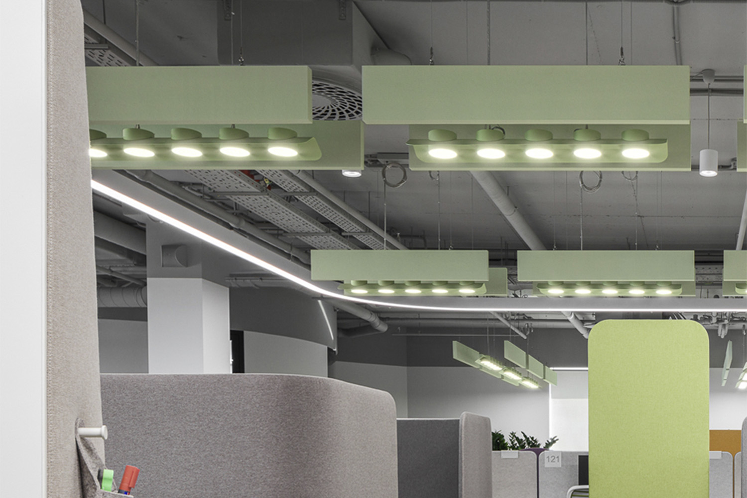 Офис будущего начинается с потолка: RINGO MAX создаёт в Comcity умный свет по задачам – от 4000K в рабочем режиме до мягкой, тёплой атмосферы для отдыха.