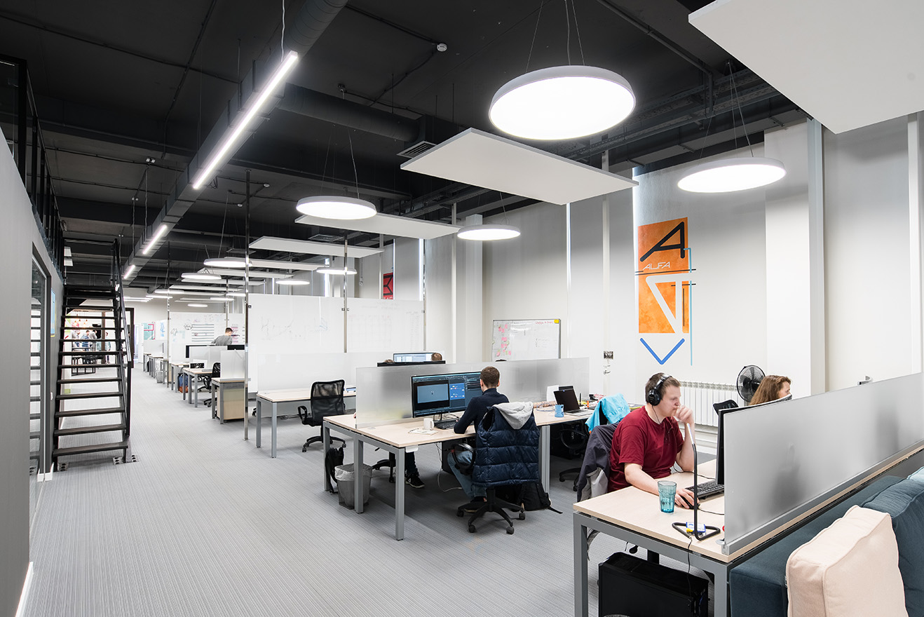 "Адмиралъ", "Особо опасен", "Обитаемый остров", "Каникулы строгого режима", "Август. Восьмого", "Метро", "Сталинград", "Ночные Стражи", "Дуэлянт", "Притяжение", и это только часть проектов студии Main Road|Post. Сотрудникам студии не важно в каких жанрах работать, они создают визуальные эффекты под разные задачи для рекламы, теле и кино индустрии. Иногда требуется легкая ретушь материала, а в каких-то проектах большая часть хронометража состоит из компьютерной графики. Любому творческому коллективу нужно функциональное и продуманное рабочее пространство для создания оптимальных условий для креатива. Учитывая специфику творческой работы, важно было создать удобное пространство с разными рабочими зонами: open space для отделов, изолированные кабинеты для сотрудников, чья работа требует особой концентрации, зоной для художников, продюсерской комнатой, пространствами для проведения встреч и для отдыха. Для увеличения полезной площади дизайнерами проекта (студия интерьерного дизайна Donati Studio) было принято решение по обустройству небольшого второго этажа. Основным цветом в интерьере стал серый, который лучше всего подчеркивает яркие акценты: мебель и роспись на стенах. Потолки были оставлены без покрытия и окрашены темно-серой краской. На нейтральном фоне выделяются две общественные зоны: деревянные беседки и яркие переговорные с диванами. Особенным местом в офисе стал амфитеатр, центр офиса, где проводятся встречи, просмотры работ и другие мероприятия. Общее освещение в офисе реализовано с использованием круглых светильников AURI. Светопропускающая мембрана этой модели светильников создает мягкий рассеянный свет и обеспечивает комфортную зрительную среду. В коридорах и проходах между столами размещены подвесные линейные светильники INI LED 01. В общественной зоне размещена конструкция из модульных светильников INI LED STAR 04 5x, такие светильники идеально подходят для создания больших световых композиций в дизайнерских интерьерах. Для освещения столовой была выбрана группа квадратных светильников разных размеров (KVADO). В качестве декоративного источника света использованы светильники BOLA. Подвесные модели светильника размещены в переговорных комнатах для создания уютной атмосферы.
