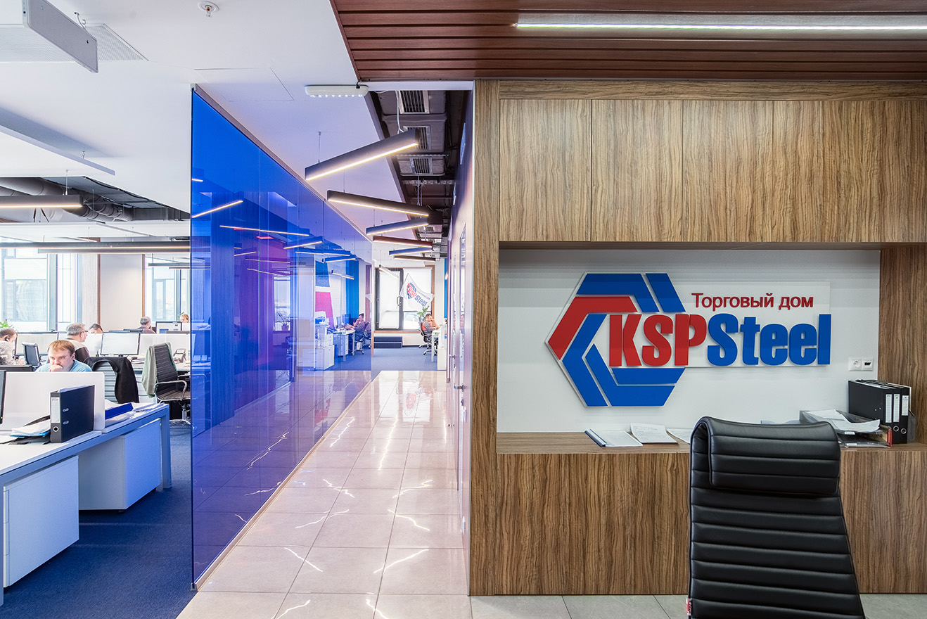 МДМ-ЛАЙТ реализовала системы освещения для офиса компании ТД «KSP Steel» — представителя казахстанского металлообрабатывающего завода, основной вид деятельности которого - изготовление стальных труб и металлопроката для нужд нефтегазовой и горнодобывающей промышленности. В настоящий момент продукция завода успешно применяется при строительстве трубопроводов на территории России. В связи с развитием бизнеса у компании возникла потребность в организации нового офисного пространства в Москве. Разработка дизайна офисного пространства была доверена специалистам Архитектурного бюро ARXY. Перед архитекторами стояла задача создать удобный и функциональный офис, отвечающий высоким стандартам компании-заказчика. При проектировании офиса было важно учесть фирменный стиль компании и использовать в оформлении корпоративные цвета. Ярким акцентом и символом компании стал декоративный элемент на стойке reception — композиция из обрезков стальных труб удачно вписалась в строгий интерьер. Для акцентирования ярких корпоративных цветов была выбрана спокойная цветовая база: белые и серые стены, а также вставки из светлого дерева. Для общего освещения офисного пространства были выбраны светильники INI LED 04, часть которых дизайнеры разместили над рабочими столами, а остальные повесили в коридорах офиса, скомпоновав своеобразным зиг-загом. Такая композиция из светильников стала интересным дополнением минималистичного дизайна офиса. Светильники INI LED 04 являются отличным источником общего освещения, имеют высокую эффективность и низкое энергопотребление, обеспечивая ярким и комфортным светом работников, проводящих в офисе много продуктивных часов. Для локального освещения зон переговоров были выбраны светильники RINGO дискообразной формы. Светильники данной серии отличаются большой площадью светящейся поверхности и специальным матовым рассеивателем. Такая конструкция светильника создает уютную световую атмосферу в обособленных зонах.