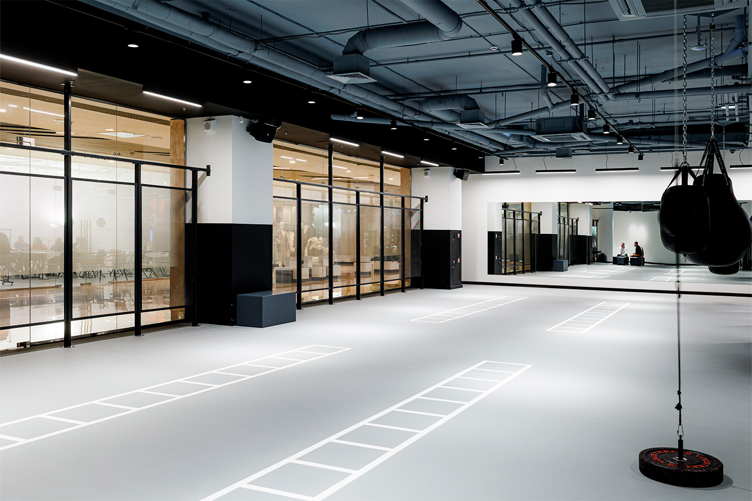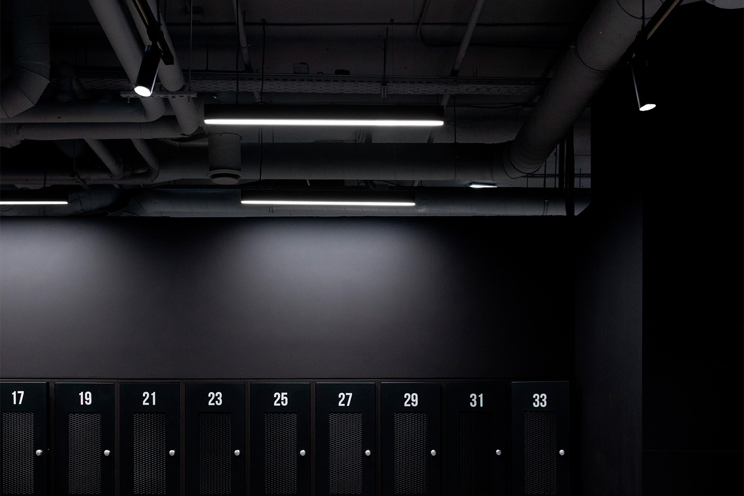 Для проекта МДМ-ЛАЙТ подобрал комплекс потолочных светильников, включая решения для общего, линейного и акцентного освещения. В разных зонах использованы серии ПЛАФФ, РУ-ТРЭК ЛАЙН, ИНИ ЛЭД 60, ГИЕРА ЛЭД СПОТ, ОВА СПОТ и ВИЗЗИ ЛЭД СПОТ. Такое сочетание позволило сформировать многоуровневую световую среду: равномерную для тренировок, направленную для акцентов и достаточно выразительную для визуальной идентичности клуба.