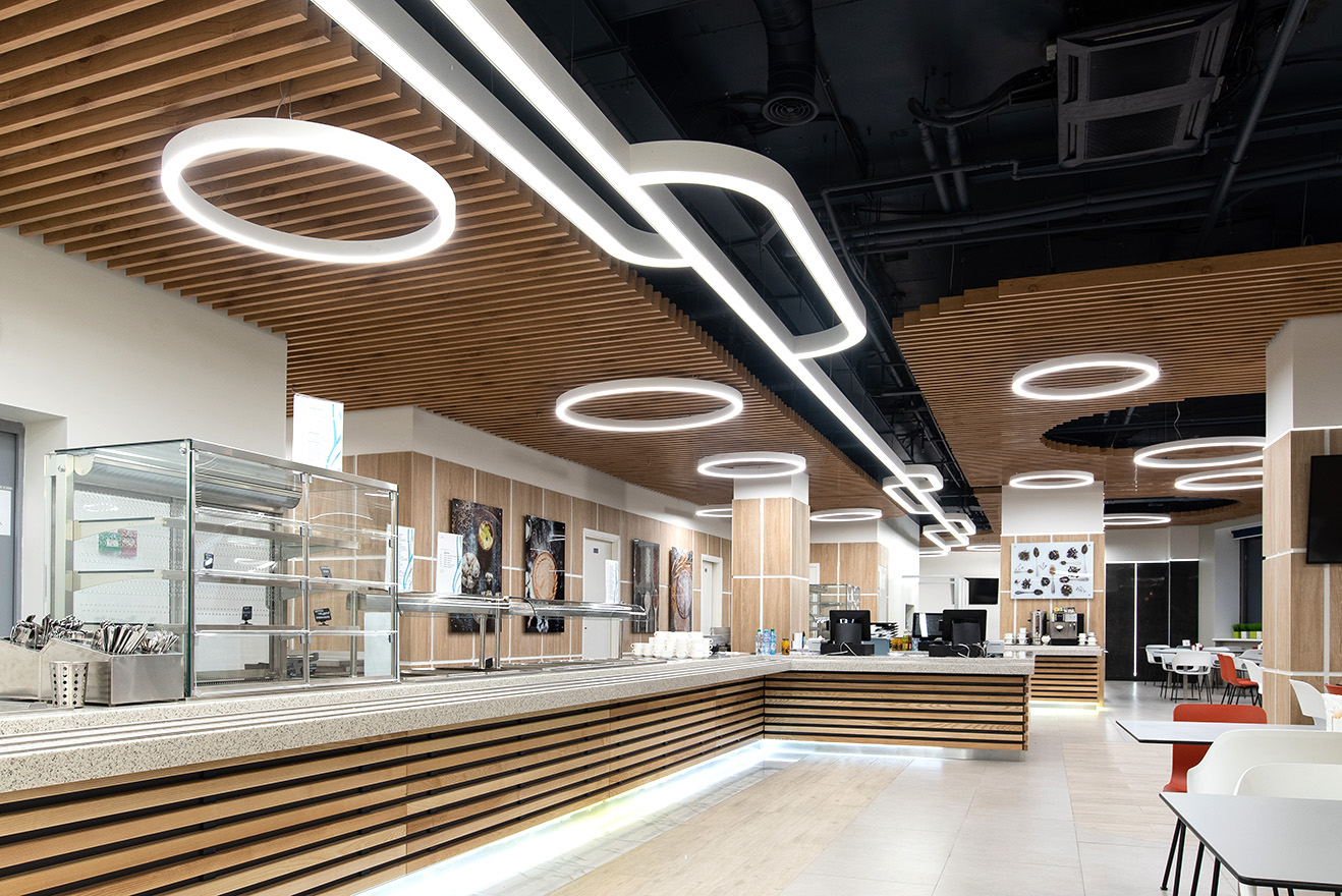 Перед нами была поставлена задача интегрировать систему освещения в сложный интерьер столовой. Сложный он из-за множества цветов, фактур и форм. Потолки образованы гипсокартонными композициями и несколькими уровнями реечных (кубообразных) потолков. Форма помещения тоже не простая, в ней много углов и перегородок, а еще есть куполообразный эркер, в котором размещена полукруглый стол. В этой зоне освещение было решено выполнить с помощью светильника ORIO CASKADE - он представляет собой группу кольцеобразных кольцевых светильников, у которых светящаяся поверхность расположена на внутренней или внешней стороне. Кольцевые светильники с нижней засветкой hoop! четырех разных диаметров подчеркивают своей формой светильник в эркере и связывают все освещение в единую композицию. Но самое интересное - это нестандартные светильник, которые мы изготовили специально по авторскому эскизу дизайнеров. Светильник - крупногабаритная, вытянутая конструкция, которая огибает зону раздачи. Сборка такого большого светильника производилась на месте монтажа.