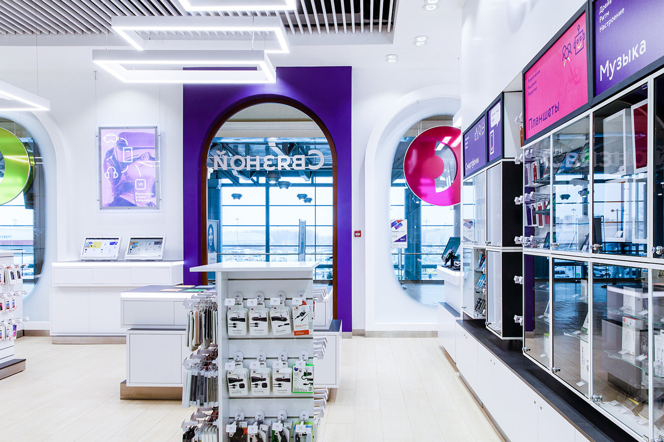 Сеть магазинов Связной в 2018 году разработала новый брендбук. Стиль магазина тяготеет к минимализму, работающему на контрасте с тяжелой отделкой галереи аэропорта из натурального камня. Такое решение подчеркивает технологичность и современность сети, дистанцируясь от классических решений. В то же время, переход от аркады галереи к интерьеру реализован с помощью нанесения на витражи пленки с растворяющимся градиентом. Это дало возможность обыграть арки изнутри, разрушив ее форму дополнительным закруглением снизу. Дополнительно формы арки акцентированы снаружи прозрачными цветовыми логотипами, что дает дополнительный логичный переход от галереи в магазин. Освещение в магазине - серия светильников CUBE, подходящая как нельзя лучше под минималистичный и технологичный интерьер! Важной особенностью технологии изготовления светильников серии CUBE является применение технологии сварки при изготовлении корпуса светильника, что позволяет получить цельнометаллический корпус без просветов в углах светильника. Разработано и производится в России. Корпус светильника выполнен из алюминия, окрашен порошковой краской. Драйвер (блок питания) интегрирован в корпус светильника, что упрощает монтаж, так как нет необходимости прятать драйвер за потолок или использовать дополнительный бокс. Матовый рассеиватель обеспечивает равномерную засветку и отсутствие пикселизации. Над кассовой зоной размещены линейные светильники INI LED 60. Качественное освещение этой зоны необходимо для создания комфортных условий работы для кассира и удобства клиента.