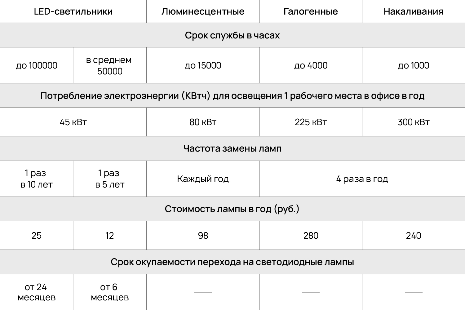 Расчет: экономия на электроэнергии позволит окупить затраты на полный переход на современные LED-светильники уже через 6 месяцев. Замена старых ламп накаливания или люминесцентных ламп на светодиоды показывает максимальную экономию.