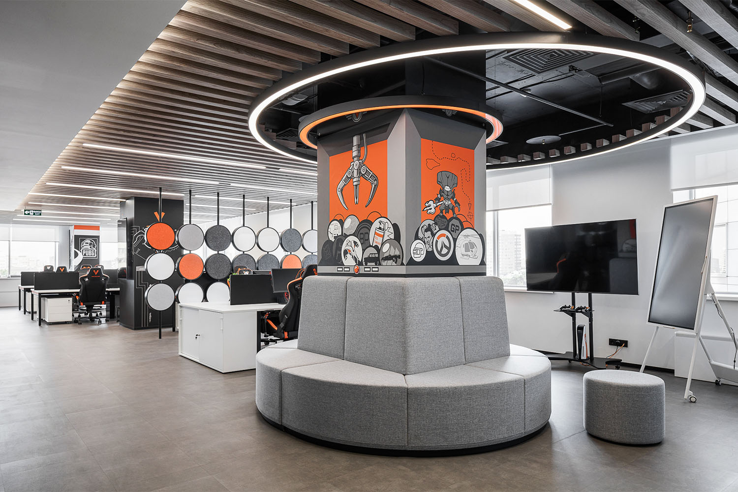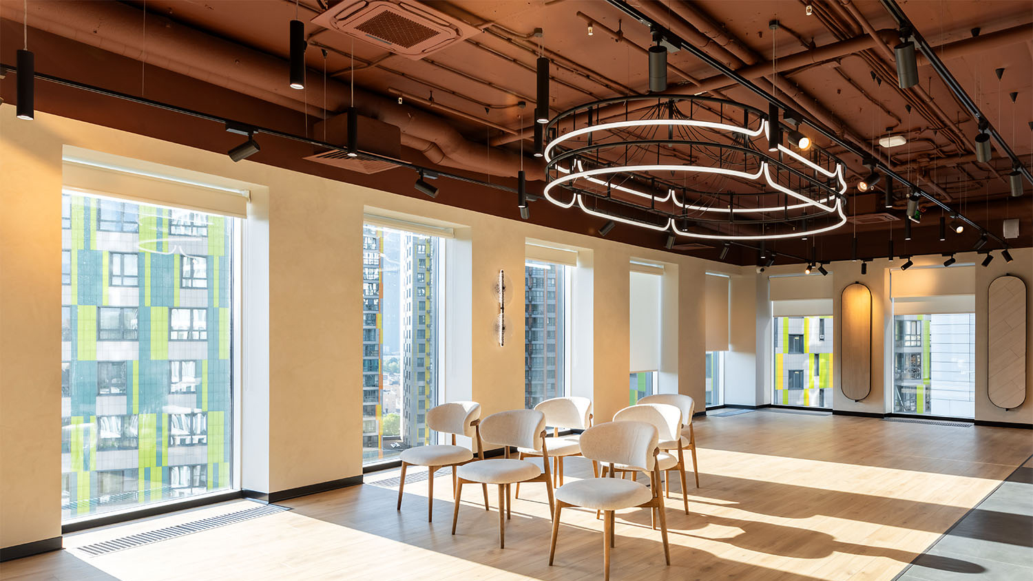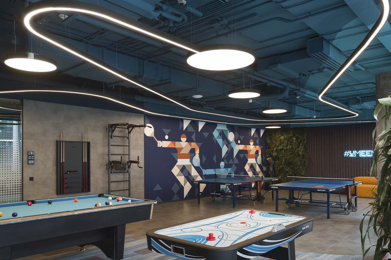 - Как использовались коммерческие светильники: в проекте использовались разнообразные современные, эффективные и энергосберегающие светильники YAMAR, BRUNIC, HOOP II, INI LED 04, INI LED 100, RINGO, ENTRO ULTRA, для общего, акцентного и атмосферного освещения зон: коворкинга, лаундж-зоны, кафетерия и др.