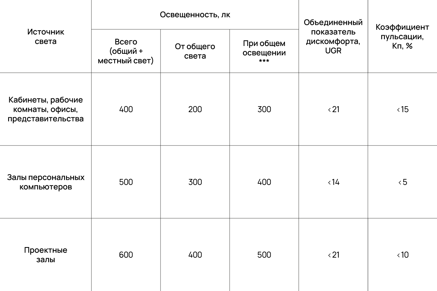 Таблица нормативов искусственного освещения офисов: лк, показатель дискомфорта*, коэффициент пульсации**