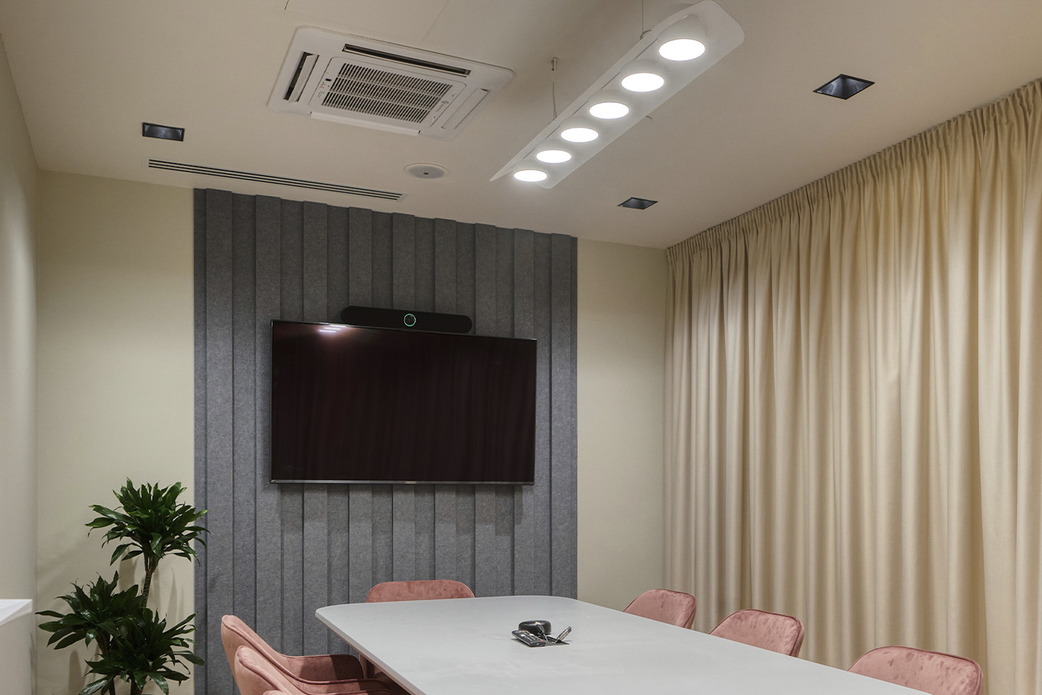 Сценарий «Переговоры» обеспечивает рассеянный, приглушенный свет (2700-3000К), такой сценарий незаменим для создания доверительной атмосферы. Для зонирования пространства и акцентной подсветки зоны переговоров рекомендуется использование светильников для открытых потолков ROTATION и др.