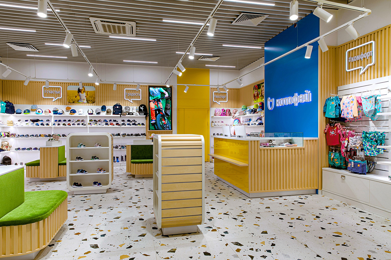 Второе решение – стилевое. Бренд предлагает не только детскую, но и подростковую обувь, что обязывает учитывать в дизайне предпочтения разных аудиторий. То есть, интерьер должен одновременно отражать образ бренда, быть ярким для детей, но не отпугивающим для подростков. В итоге получилось спокойное, но насыщенное цветом пространство, с желтыми и синими цветными вставками на стенах и актуальным тераццо на полу.